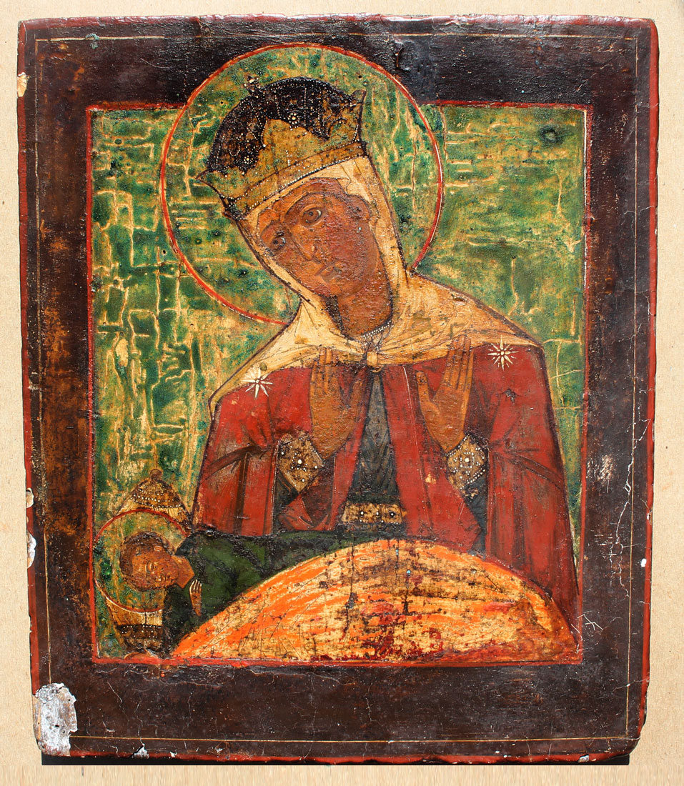 ICON PAINTING CHILD AND MADONNA: Oil/Wood panel, Cyrillic inscription verso, 12.50'' x 10.50''.