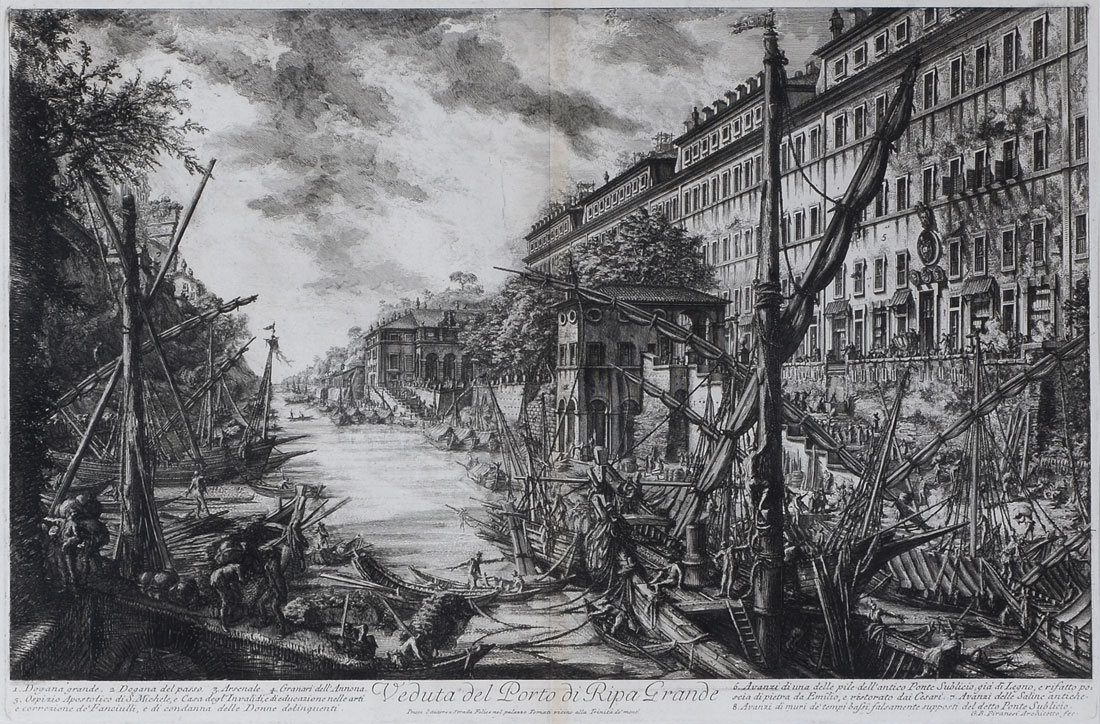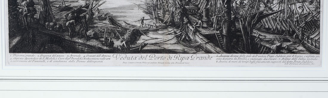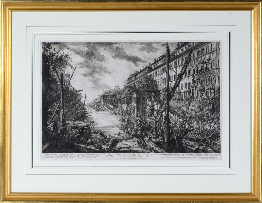 PIRANESI ENGRAVING: ''Veduta del Porto di Ripa Grande'', View of the Port of Ripa Grande, from Vedute di Roma (Roman Views). Sight size is 16'' x 24.5'', framed, 27.5'' x 35.5''. Provenance: Leon and ''Billy'' Goldenberg Collection.