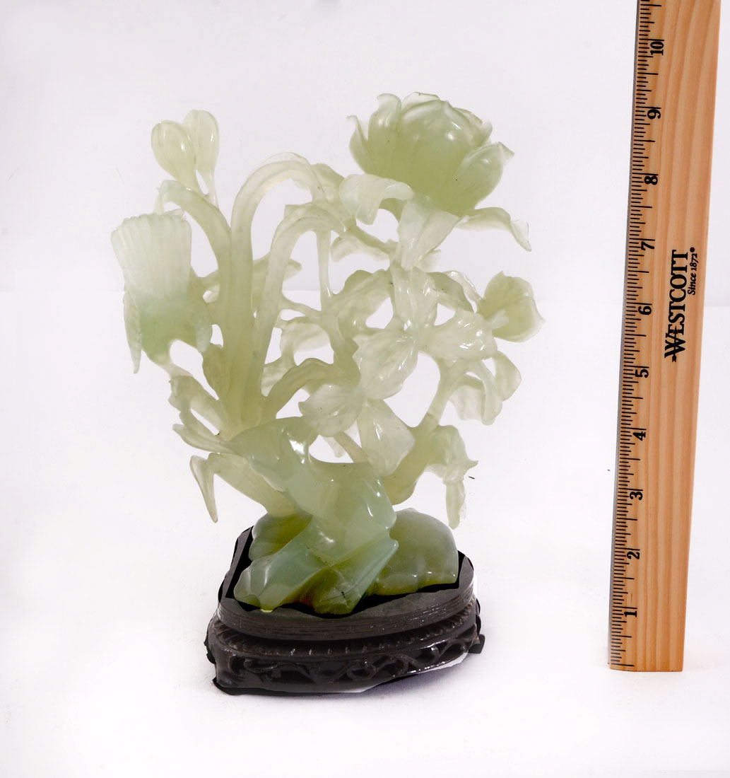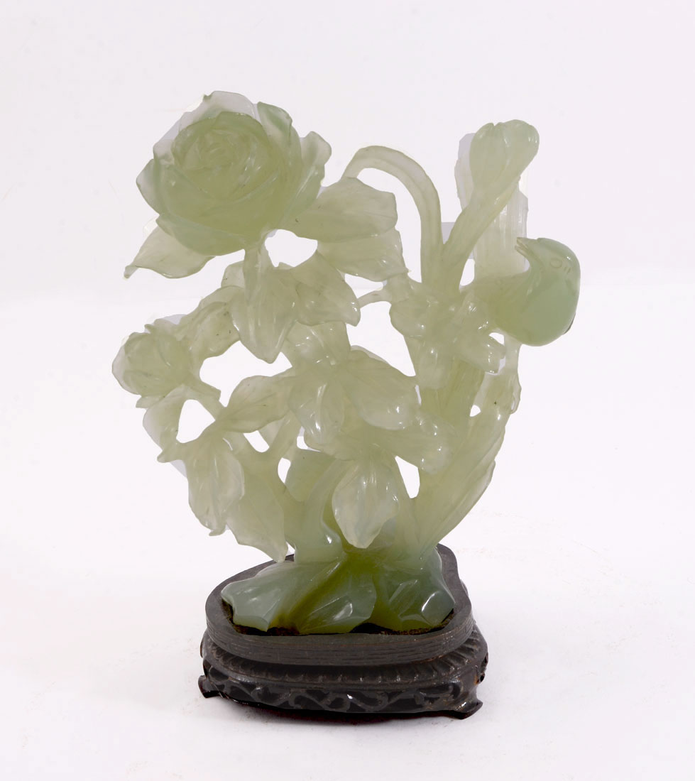 CARVED SERPENTINE JADE BIRD FIGURAL GROUP: Carved serpentine jade or similar stone figural group with bird and roses, no visible markings, 7 1/2'' h. x 6 3/4'' x 3''. Sold with fitted wood base, 1 1/4'' h. x 4 1/2''.