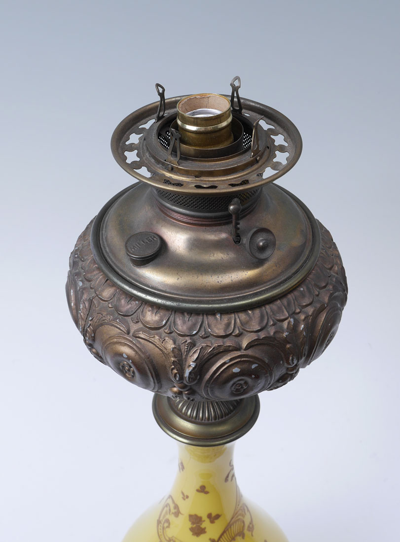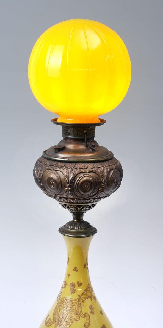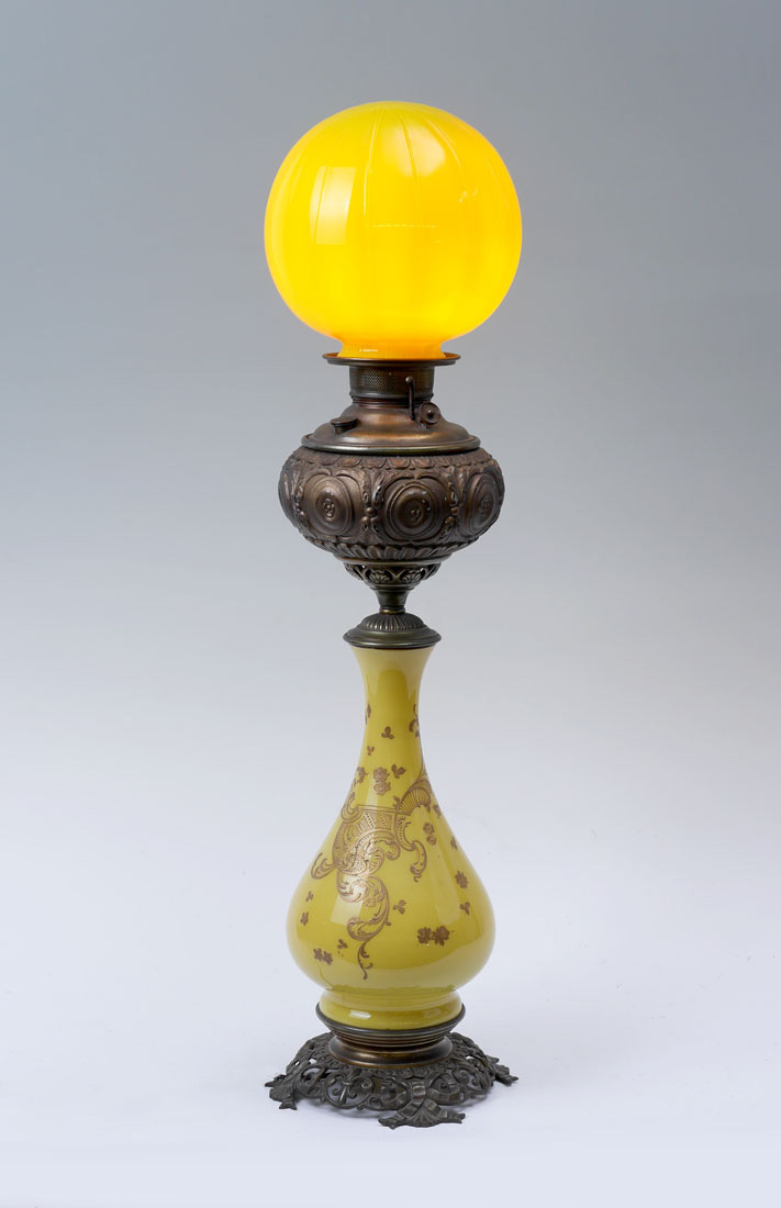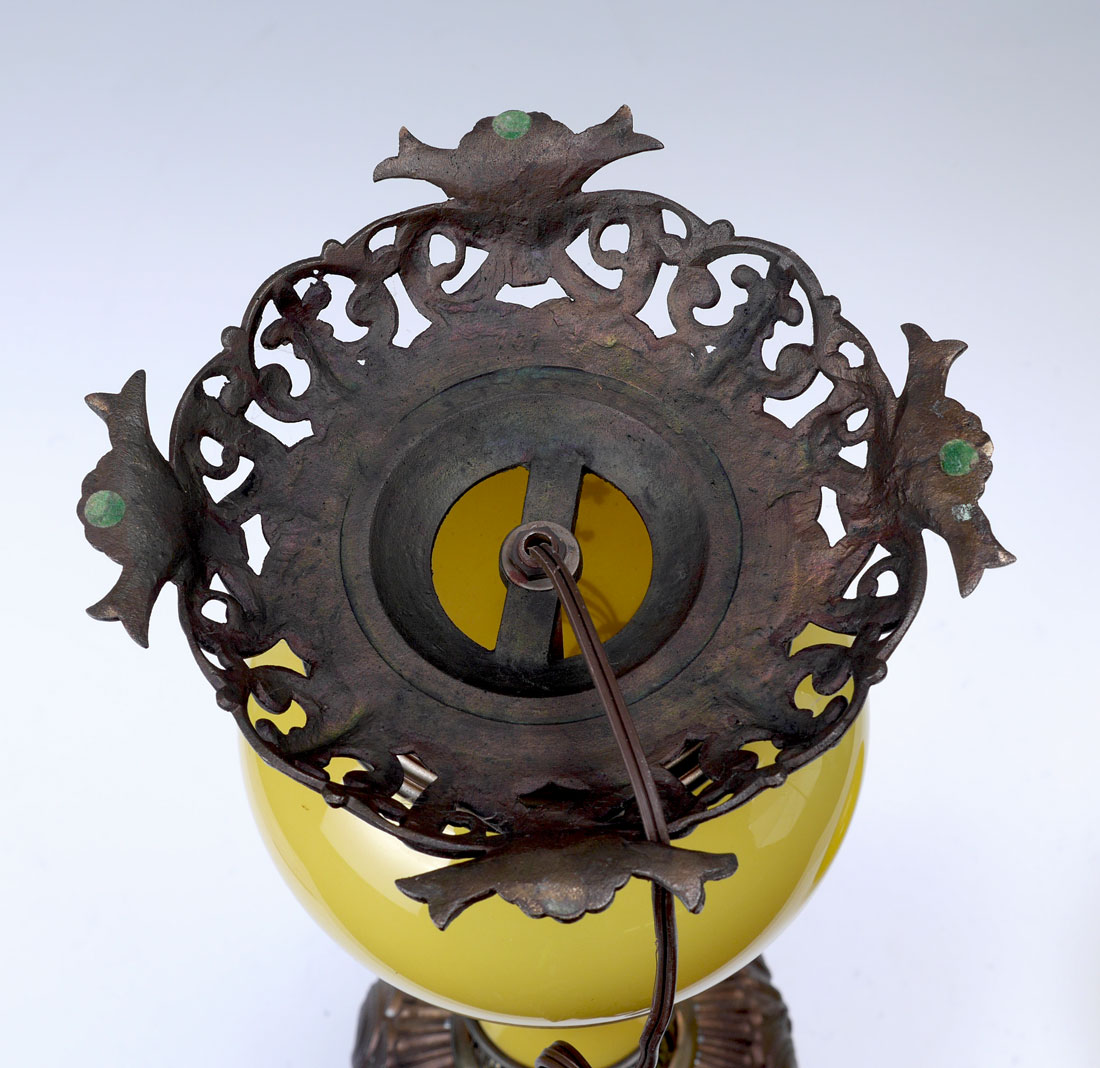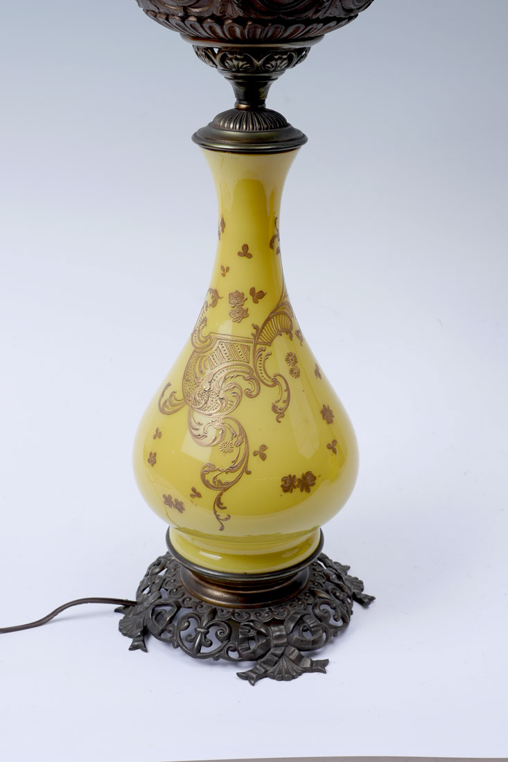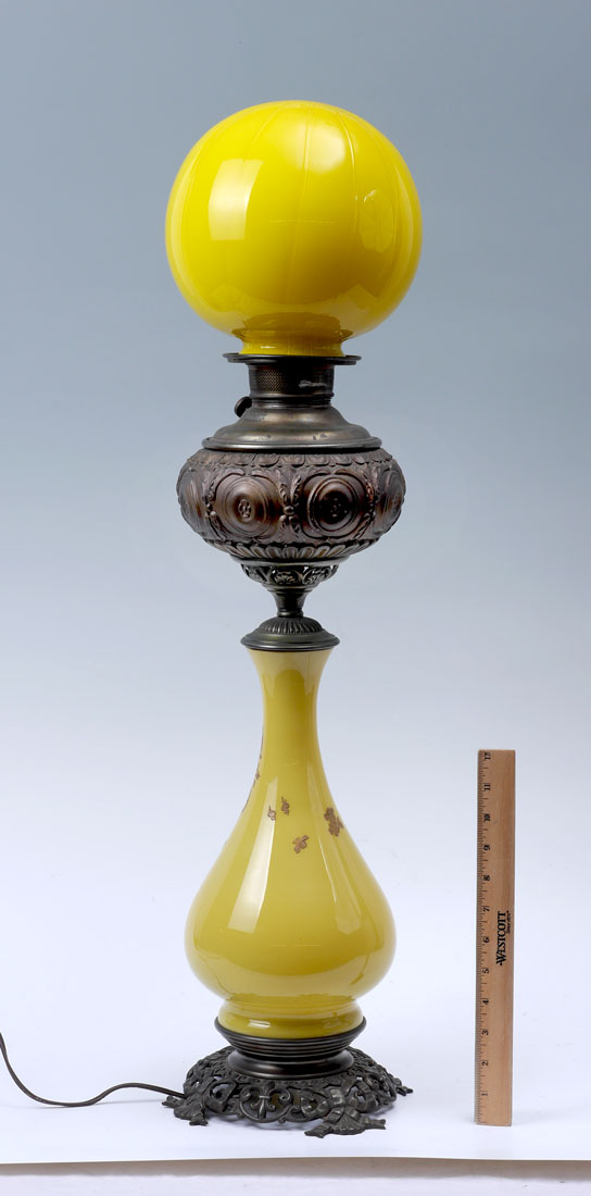 MILLER JUNO YELLO GLASS & BRASS BANQUET LAMP: Top of embossed brass reservoir cover marked The Juno Lamp, Made in the USA. Shaped yellow glass body with gold decorated foliate scroll and floral motif, reticulated brass base, electrified, 26'' h. x 9'' dia. Ribbed yellow glass globe shade, 8'' h. x 8'' dia., fitter rim 3 1/2''.