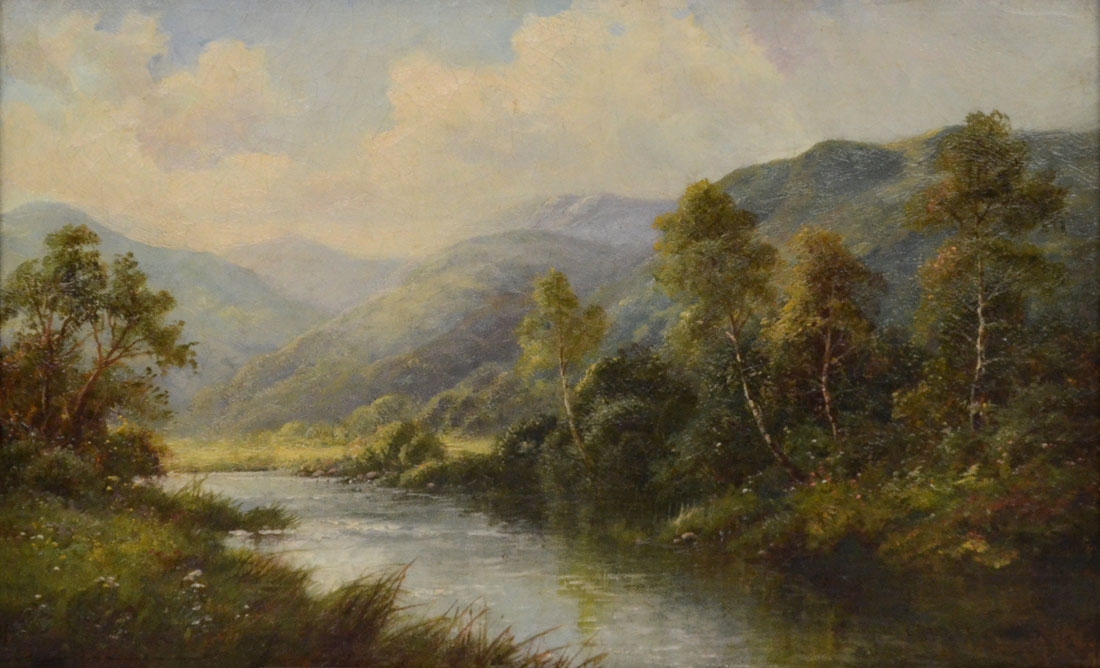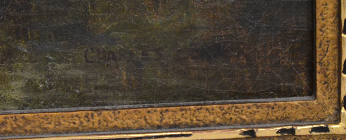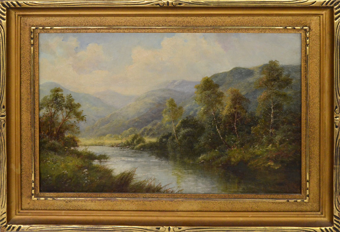 GOOD HIGHLAND RIVER LANDSCAPE PAINTING: Oil/Canvas, 12'' x 18'', signed lower right ''Charles Leader'', encased in a gilt carved frame that measures 17'' x 23''.