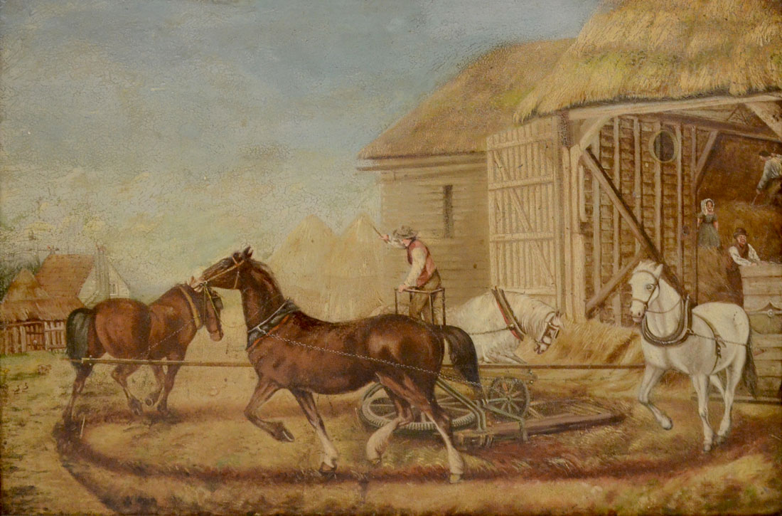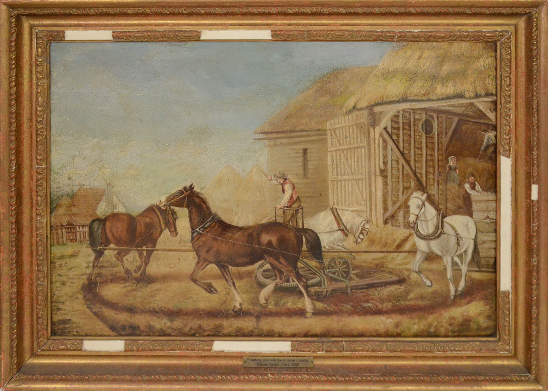 19TH ENGLISH SCHOOL PAINTING THRESHING CORN: Oil/Board, 16.75'' x 24.75'', no visible signature, framed 22'' x 30''.