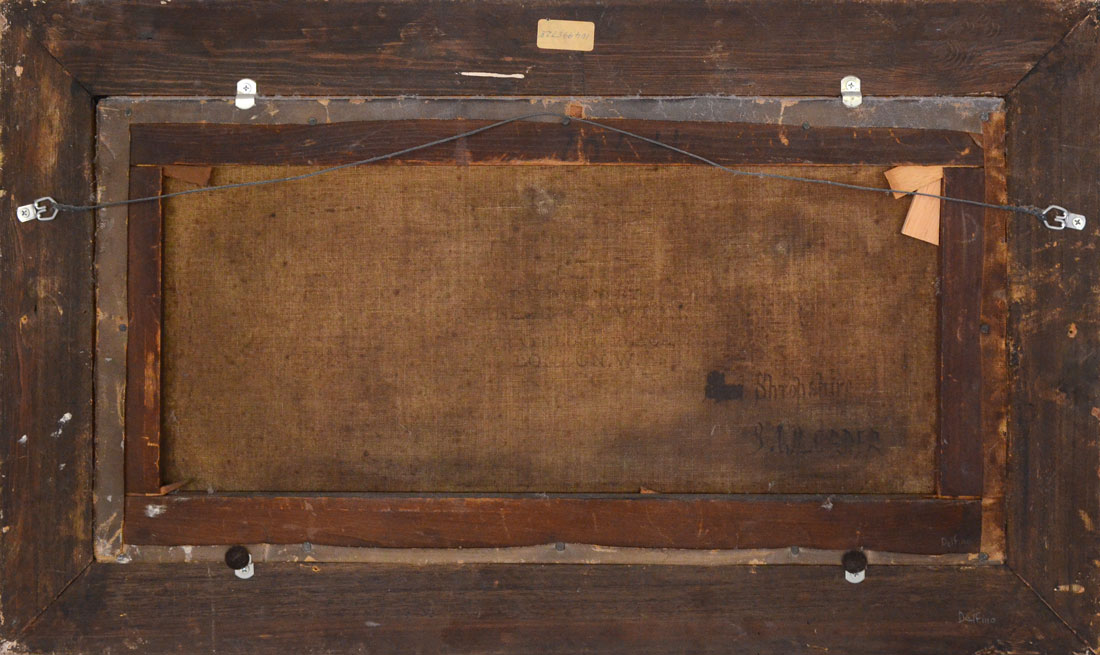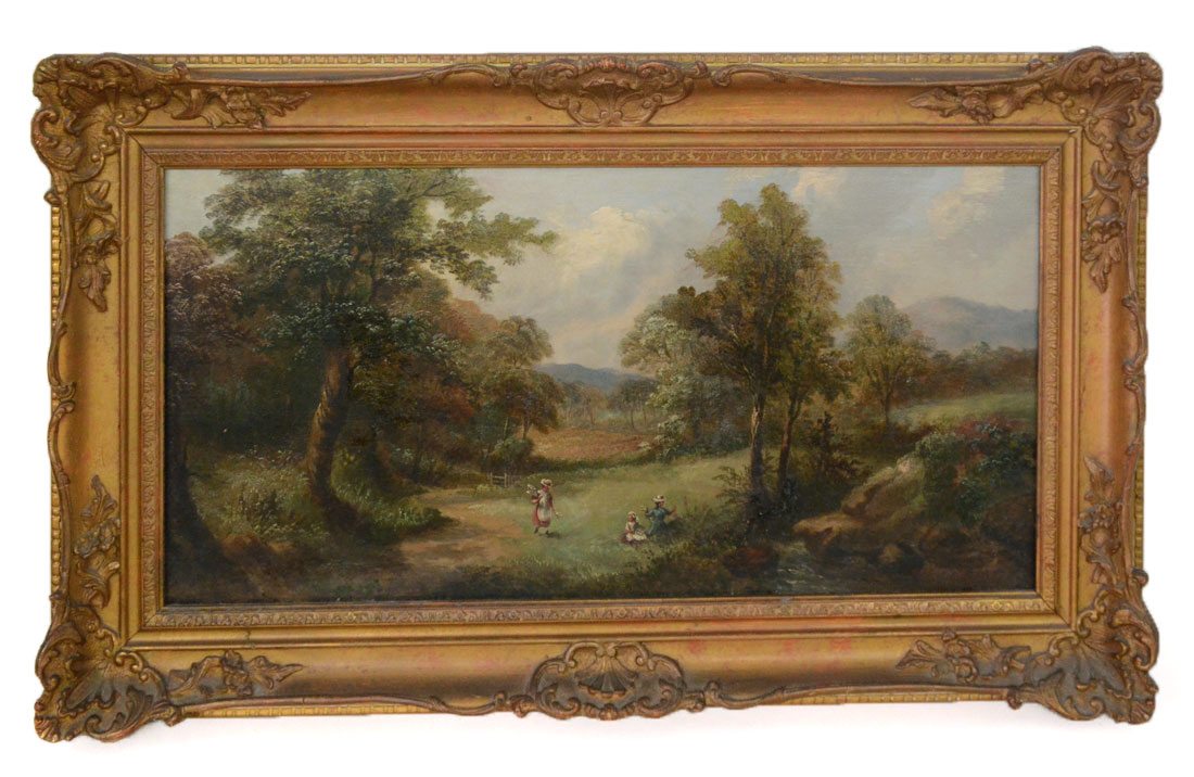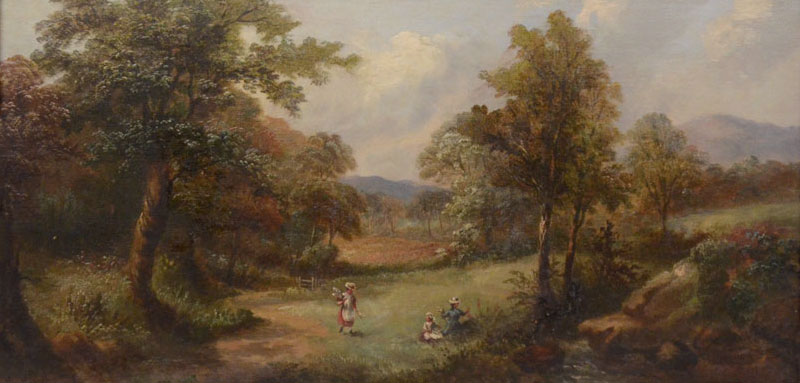 SHROPSHIRE LANDSCAPE PAINTING SIGNED LEADER POSSIBLY BY BENJAMIN LEADER: ''Scene Depicts Three Young Girls Gathering Flowers in a Panoramic Landscape'', Oil/Canvas, 12'' x 24'', signed lower right, titled on the canvas verso along with the inscription ''BW Leader'', gesso framed 17.50'' x 29.50''.