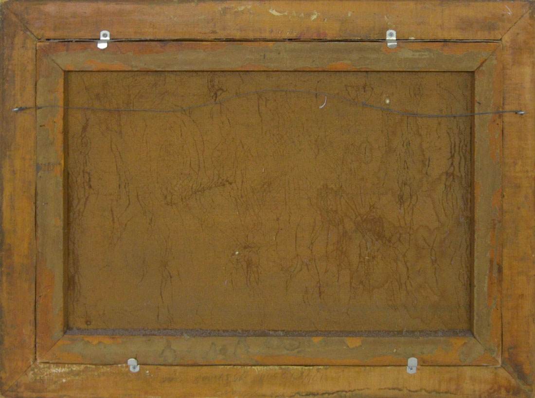 CONDITION: Frame shows wear and repair, painting has been relined, scattered craquelure, stretcherbar wear, flecks of house paint, inpaint in left margin, sold as is.