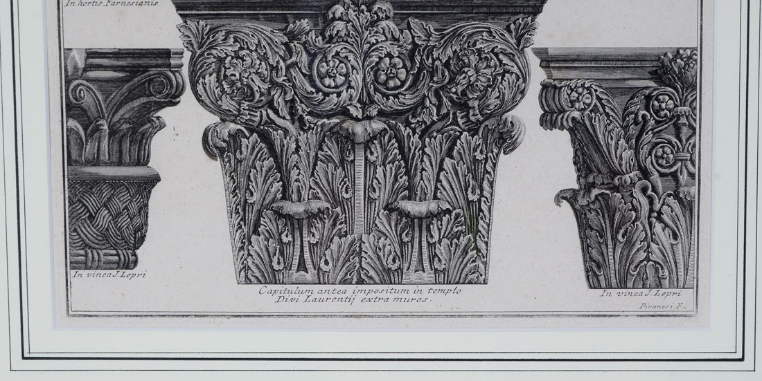 PIRANESI ENGRAVING: ''Capitulum Antea Impositum'', sight size 18.5'' x 11.5'', framed, 26.5'' x 18.5''. Provenance: Leon and ''Billy'' Goldenberg Collection.
