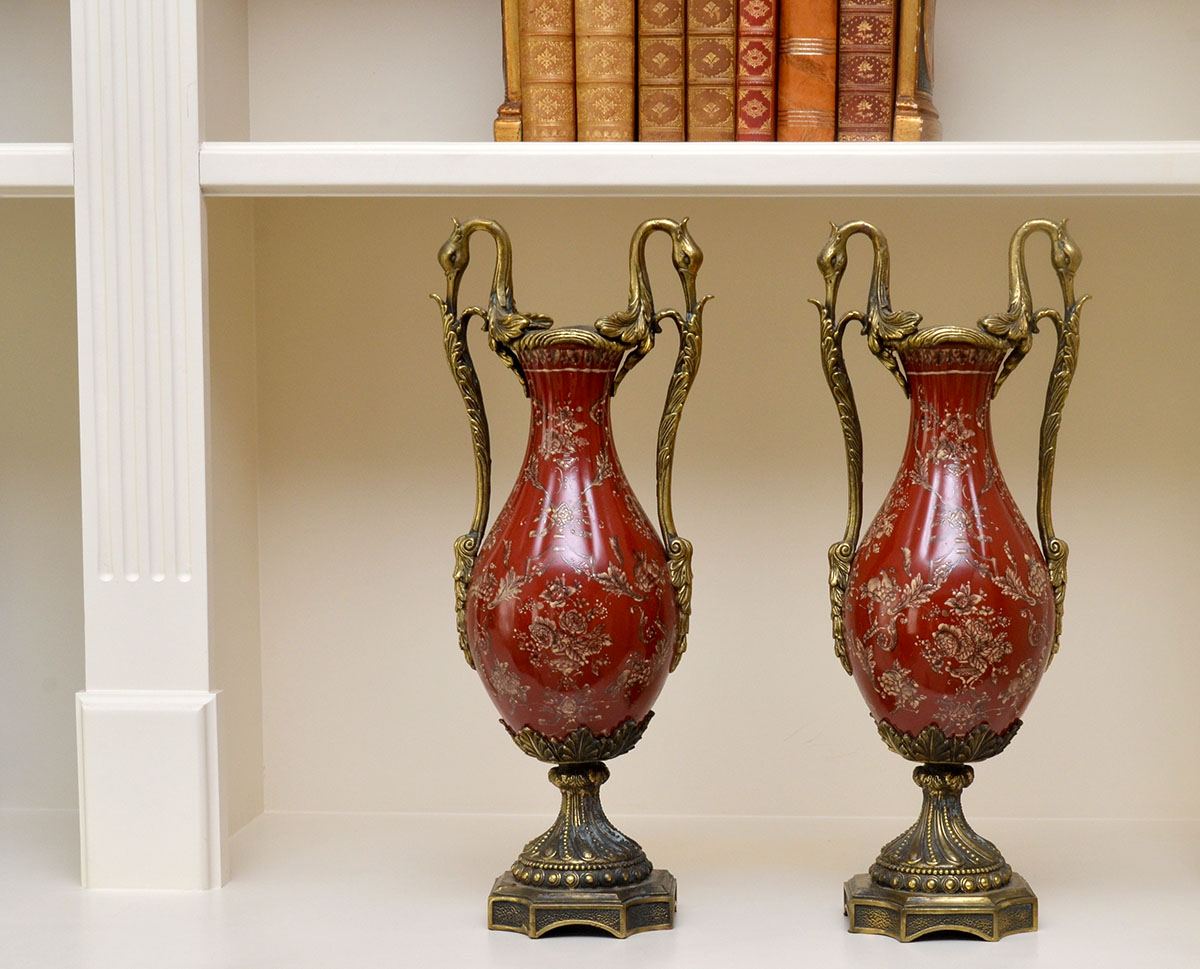 PAIR OF DECORATIVE SWAN MOUNTED URNS: Contemporary decorate gold decorated metal mounted urns, figural swan handles, floral ceramic body with red ground, metal mounted base, 18 1/2'' h. x 7 1/2''.
