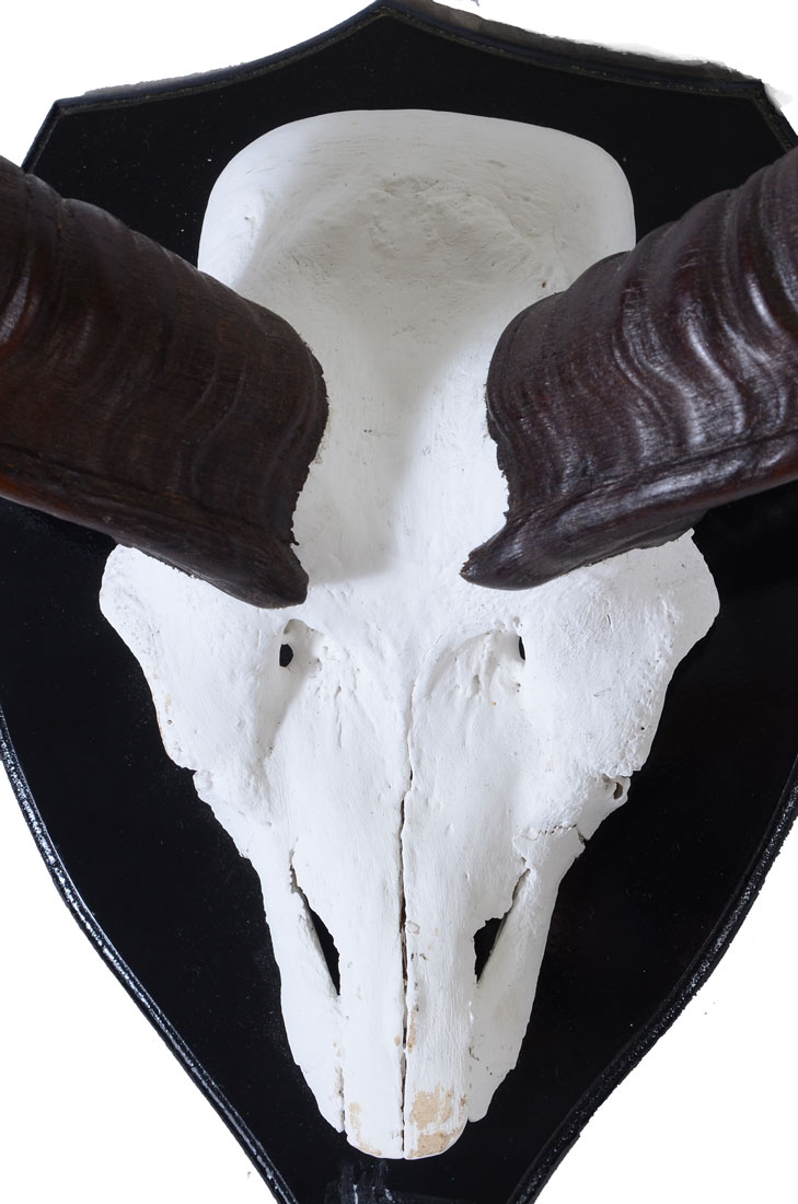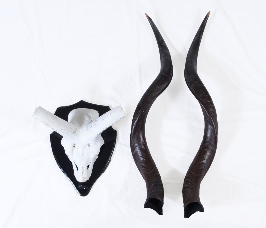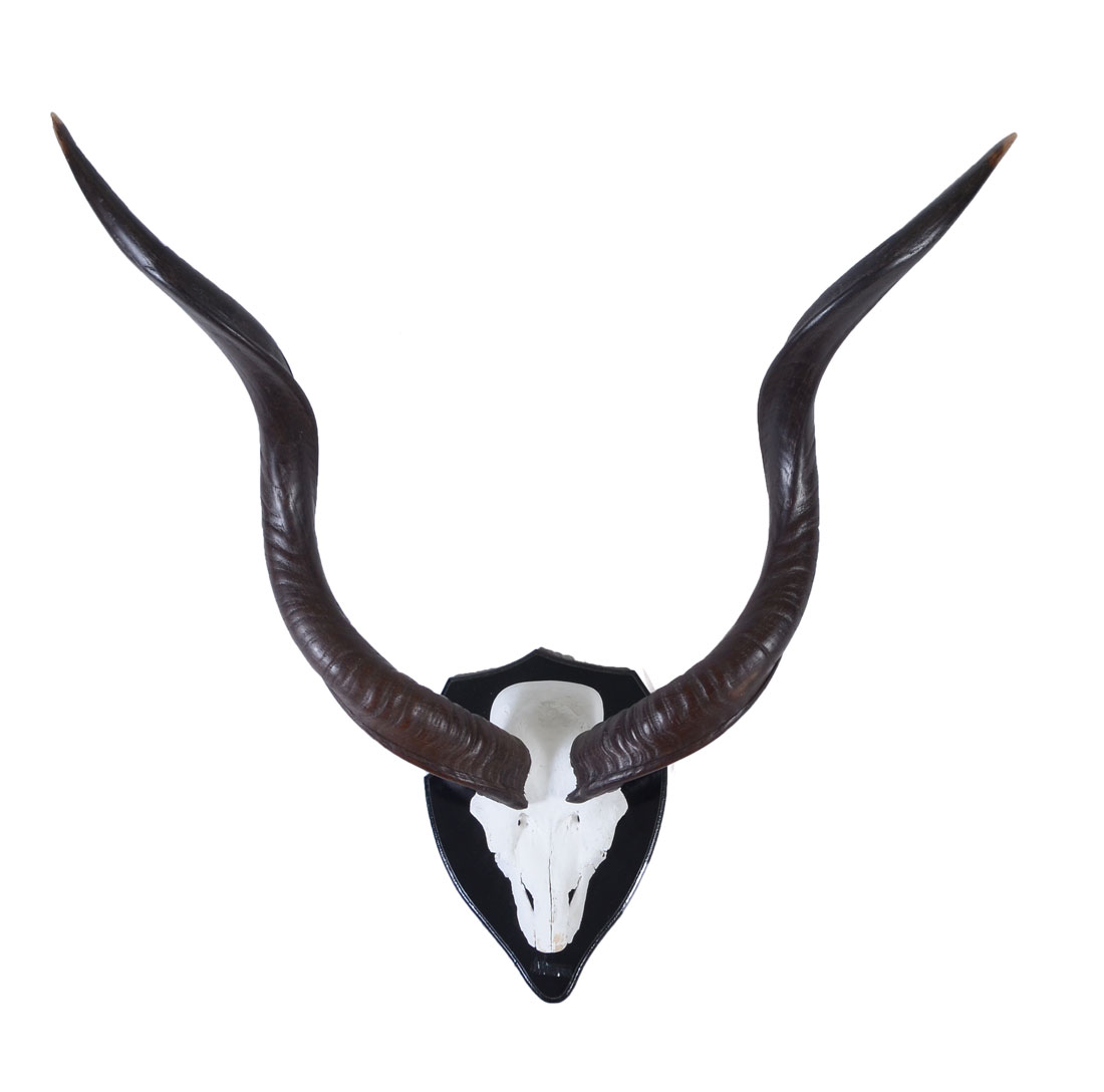 NICE PAIR OF AFRICAN KUDU HORNS: Pair of horns, longest approx 32 1/2''. Horns mount on and can be removed from a casted painted composite skull, 15'' h. x 10 1/4'' x 8 1/2''. Sold with export paperwork.