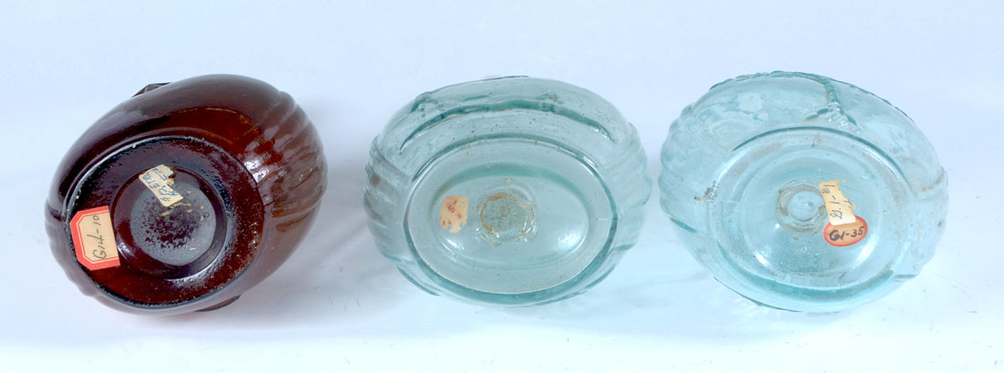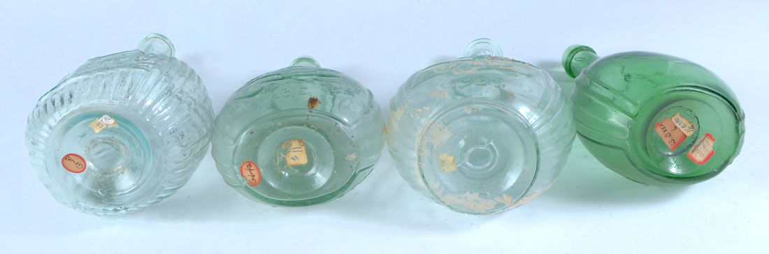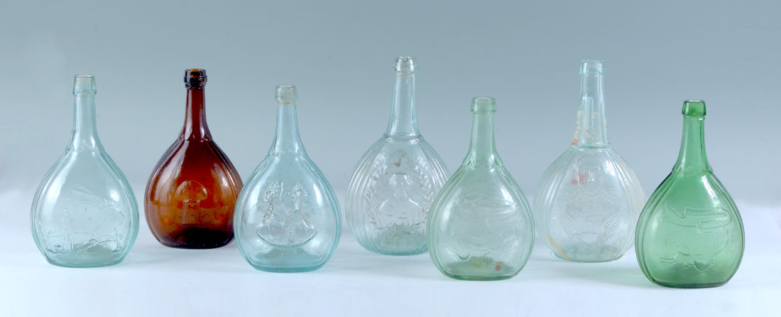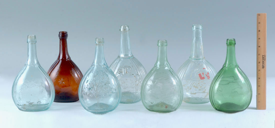 7 ANTIQUE HISTORICAL CALABASH FLASKS: An assembled collection of 7 calabash bottle flasks to include 1) GI-129, obverse with portrait of Franklin Roosevelt over eagle with shield and motto, reverse with ''TVA'' over hand with lightning over dam over ''1936'', clear quart, 10 1/4''. 2) GI-35, obverse with portrait of George Washington, reverse with tree, aquamarine, calabash quart, 9 1/4'' h. 3) GII-143, obverse with eagle over shield and holding banner, reverse plain, green, calabash quart. 4) GXIII-5, obverse hunter facing right shooting gun, reverse fisherman facing front and tree, aquamarine, calabash quart, 9 1/2''. 5) GXIII-44, obverse with sheaf of wheat, reverse with 8 pointed star, calabash quart, amber, 9 1/4''. 6) GIV-42, obverse with stars and wreath surrounding shield with clasped hands over Masonic square and compass over ''UNION'', reverse eagle and shield over ''A. R. S.'', aquamarine, calabash quart, 9''. 7) GI-103, obverse with ''JENY.LIND'' over portrait, reverse view of a glasshouse, light aquamarine, calabash quart, 10'' h.