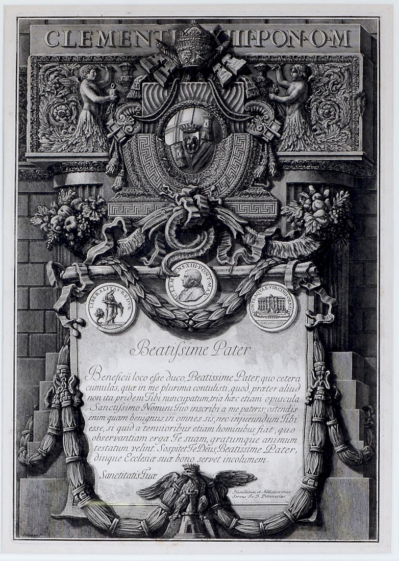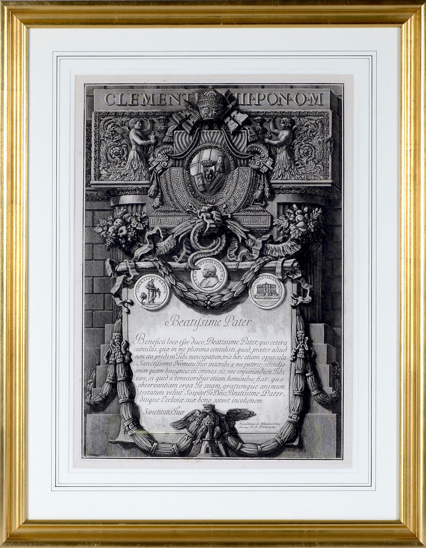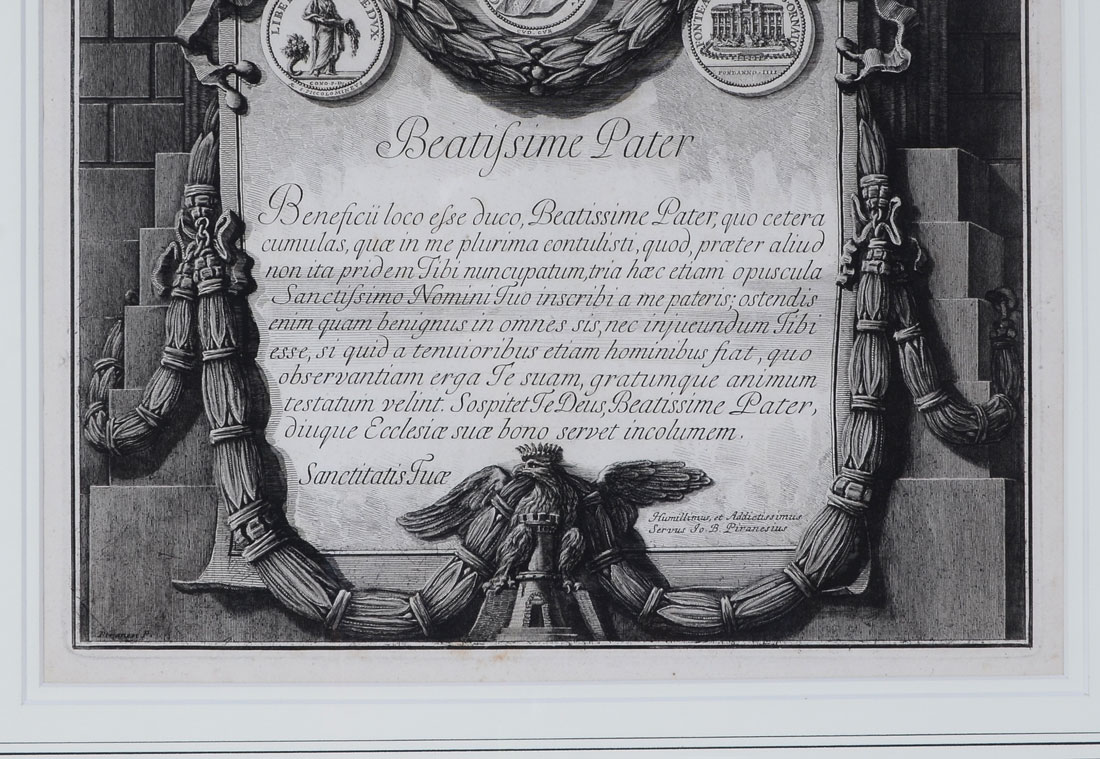 PIRANESI ENGRAVING: Piranesi ''Beatissme Pater'', Dedication to Pope Clement. Sight size 20.5'' x 14.5'', framed, 29'' x 22.5''. Provenance: Leon and ''Billy'' Goldenberg Collection.