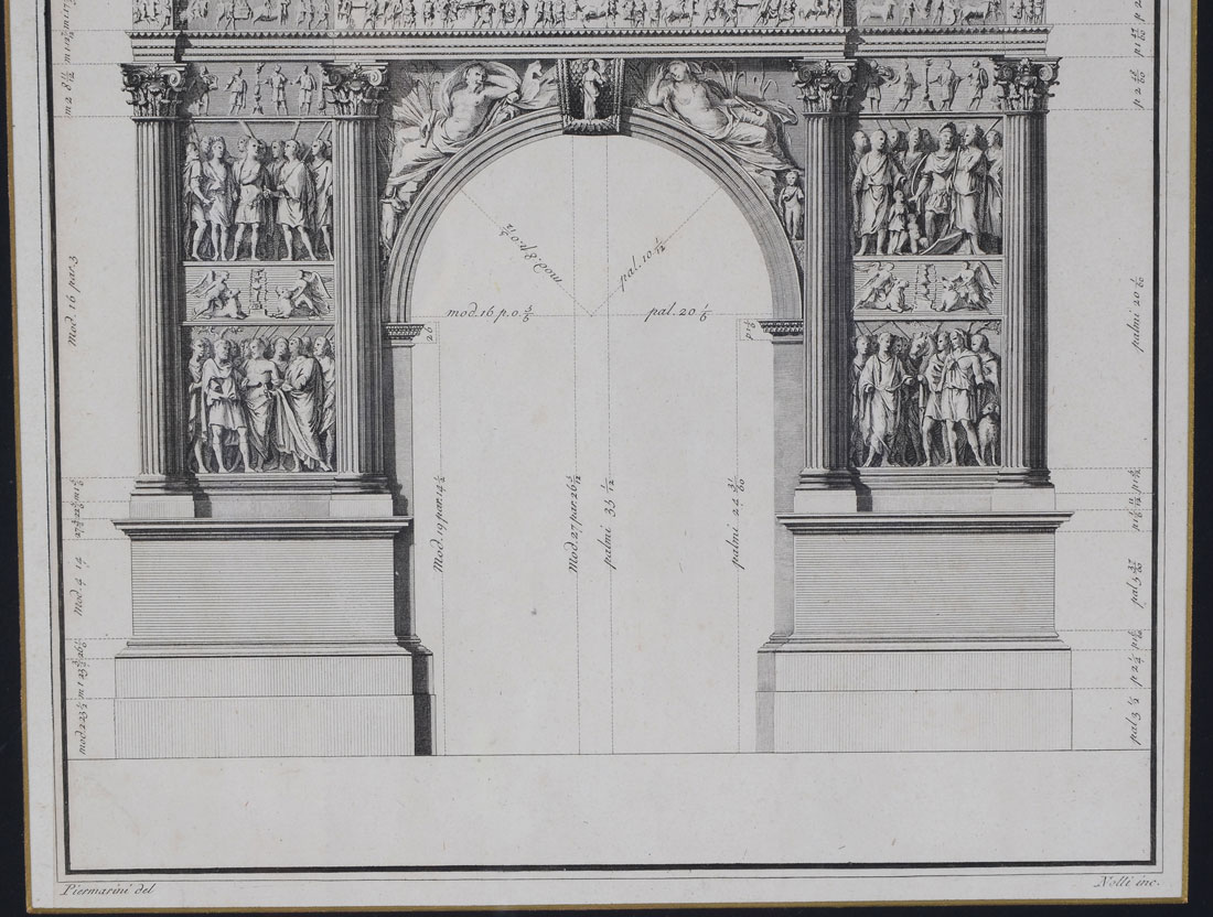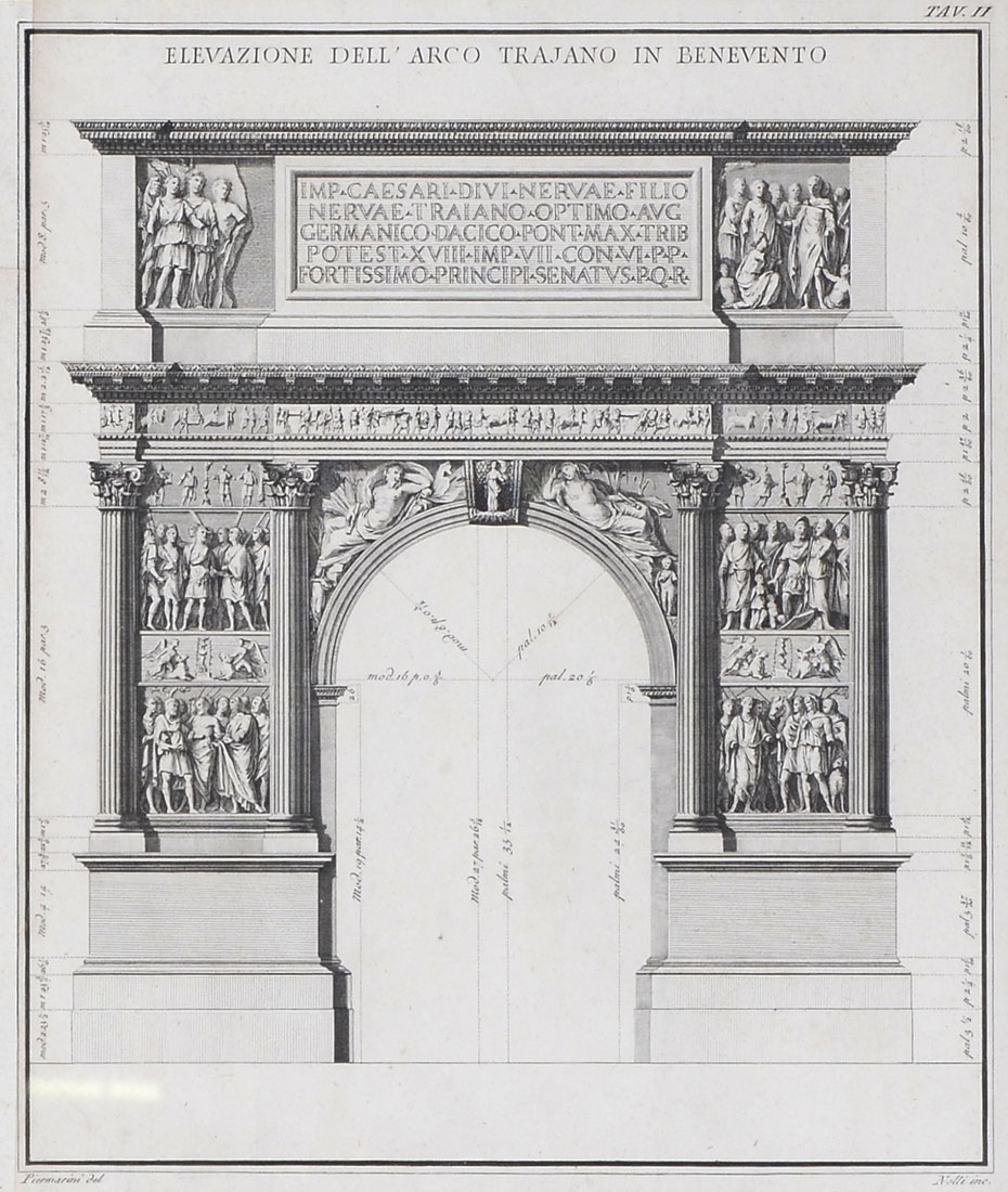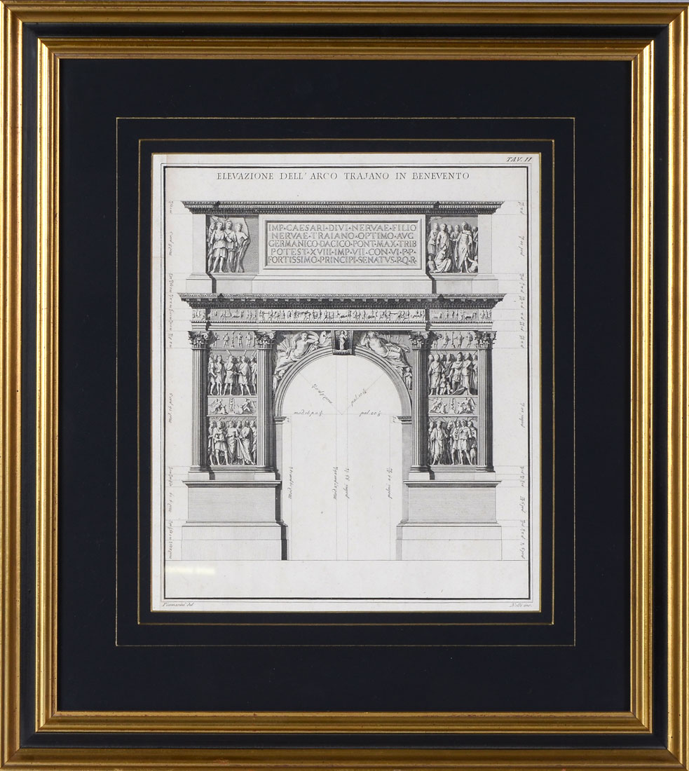 PIRANESI ENGRAVING: ''Elevazione Del Arco Trajano in Benevento'', sight size 13.5'' x 11'', framed, 23'' x 20''. Provenance: Leon and ''Billy'' Goldenberg Collection.