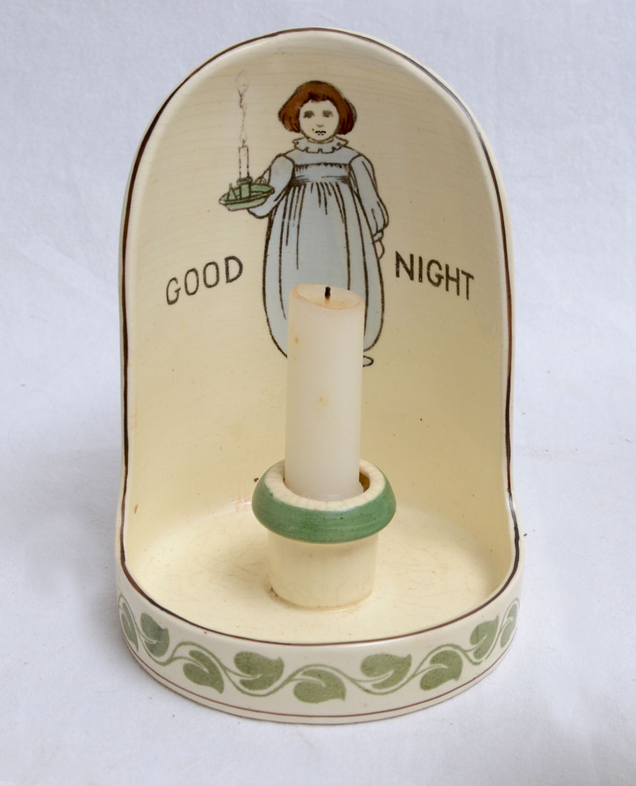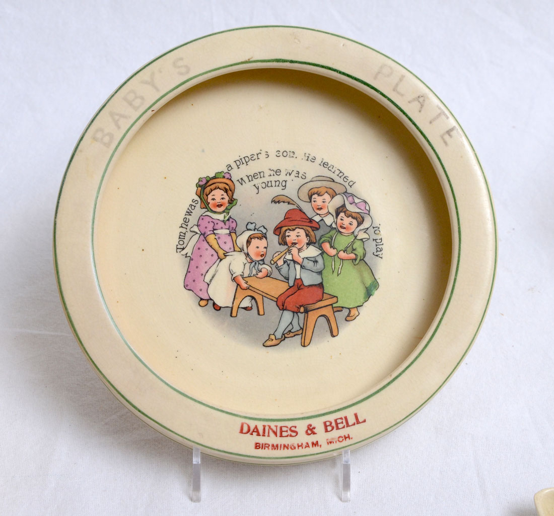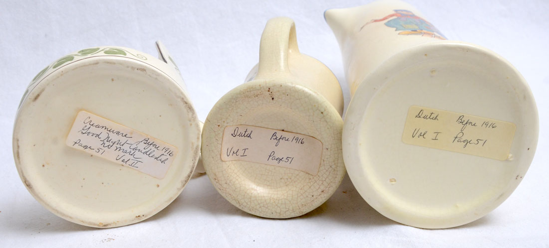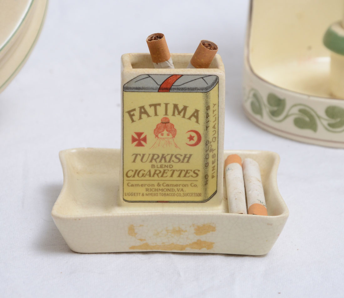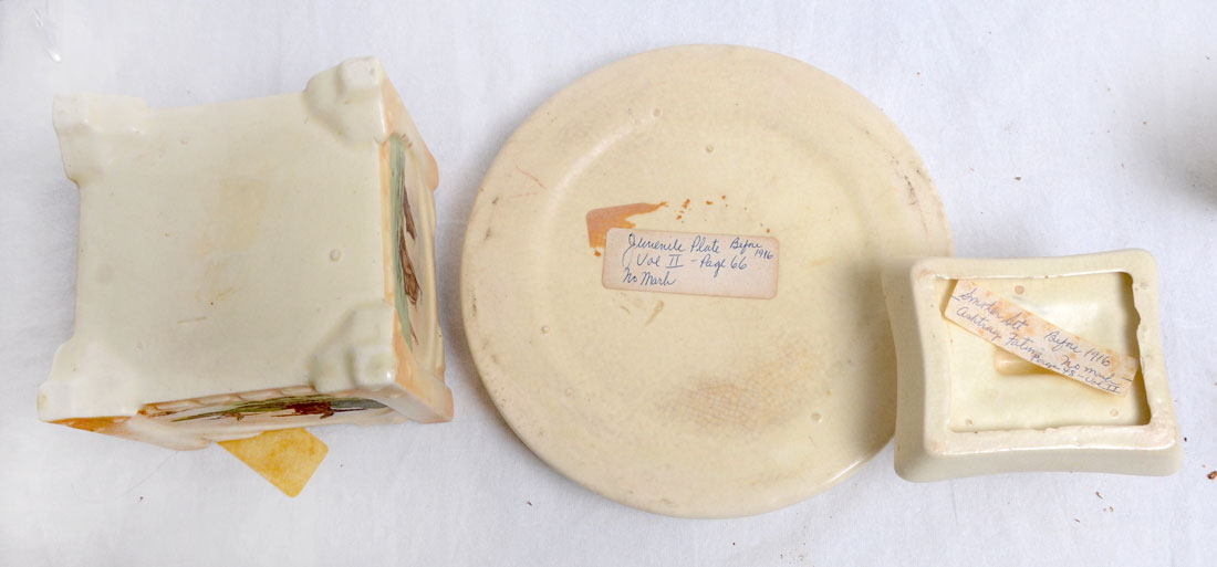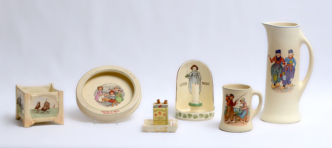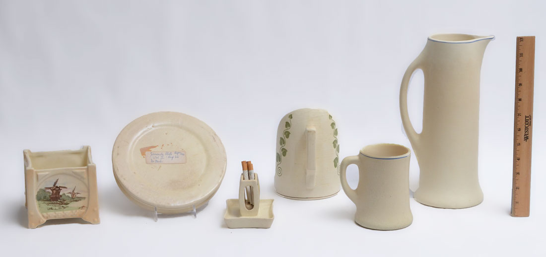 6 PIECE ROSEVILLE POTTERY CREAMWARE: An assembled collection of 6 pieces total to include 1) Dutch Tankard, 11 1/4'' h. 2) Baby's plate, 7 3/4''. 3) Dutch mug, 5'' h. 4) Landscape square open box, 4'' h. 5) Fatima Cigarettes smoking set, 3'' h. 6) Good Night candlestick, 6 1/2''.