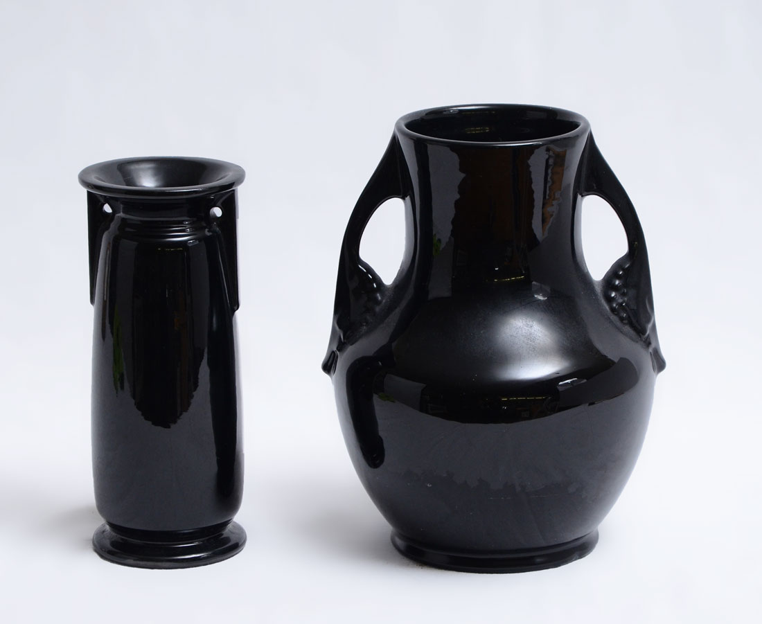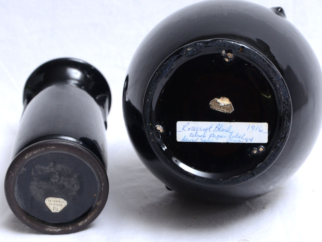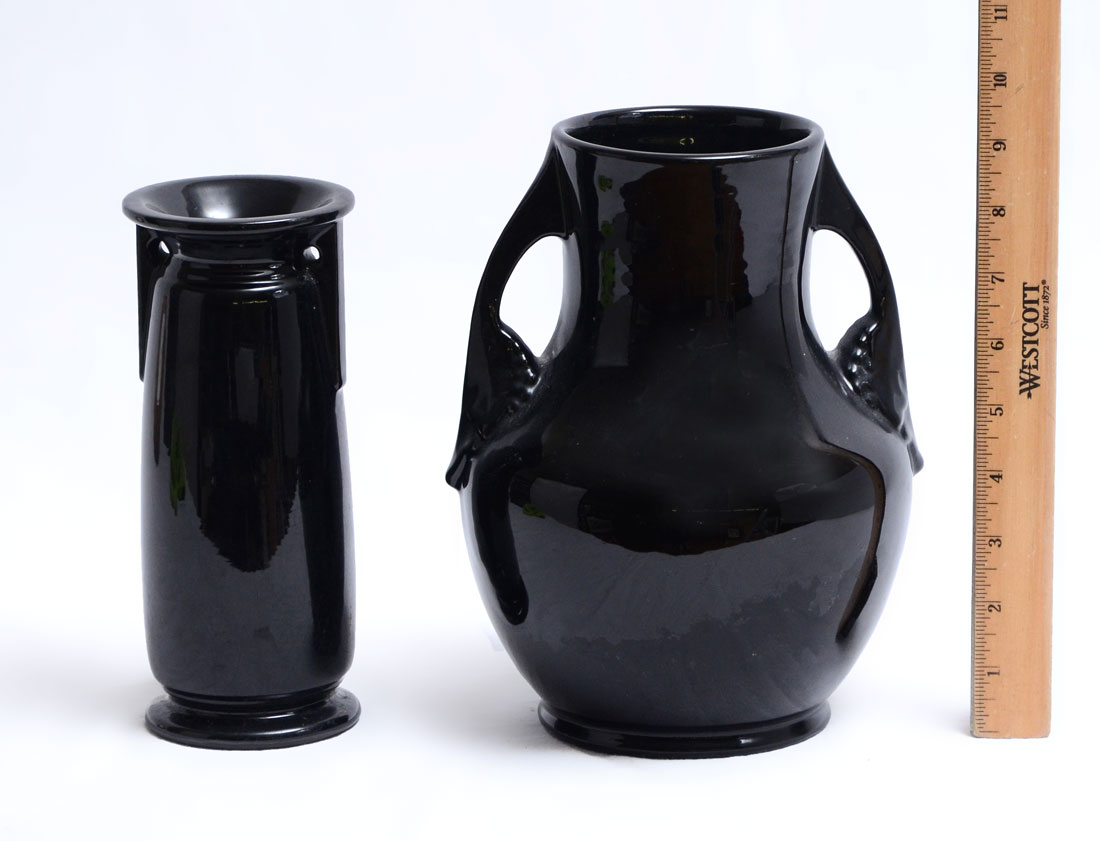 2 PIECE ROSEVILLE ROSECRAFT BLACK POTTERY: 2 pieces total with foil Roseville labels to include 1) 346-9 Tuscany form double handled vase, 9'' h. x 7 1/2''. 2) Vase with flared rim, 8 1/4'' h.
