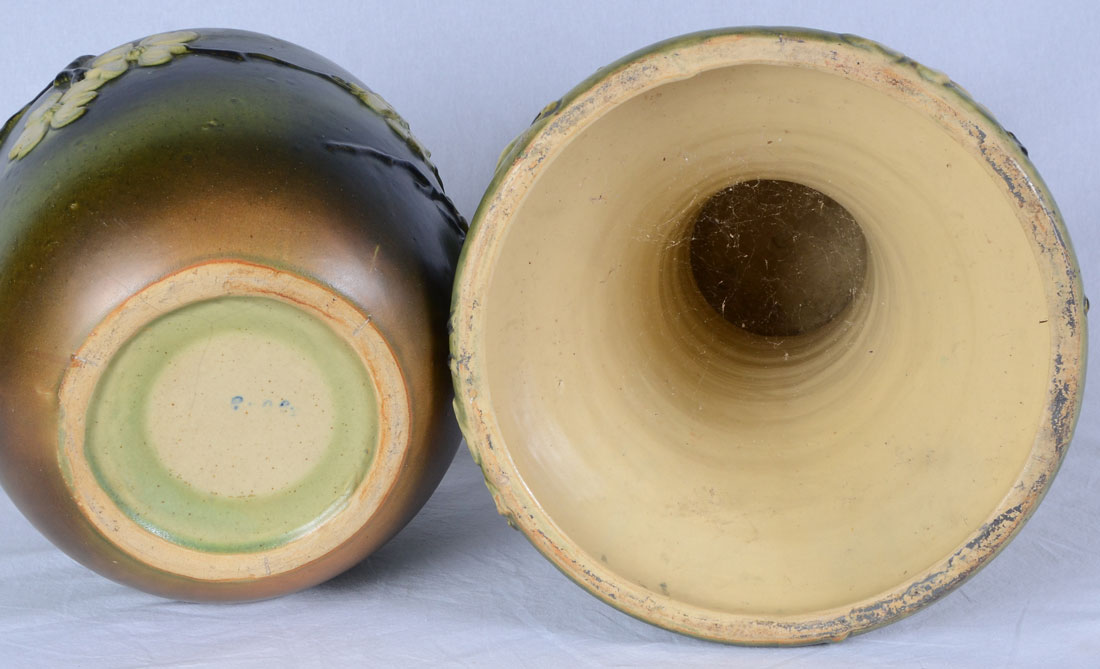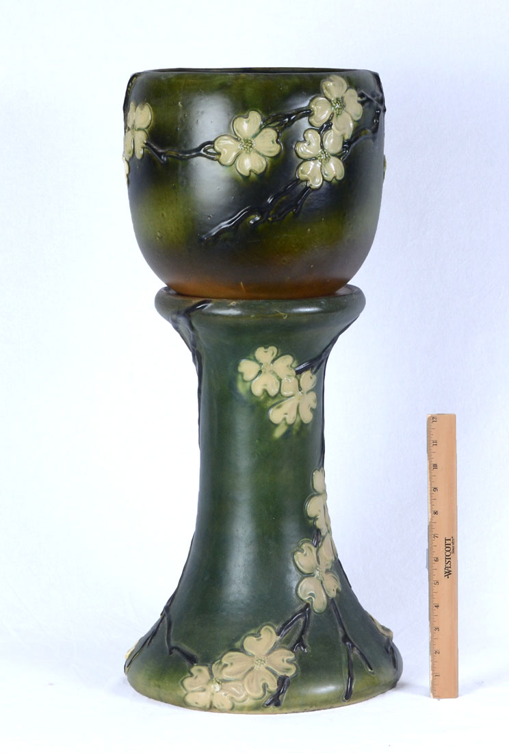 ROSEVILLE POTTERY DOGWOOD JARDINIERE AND PEDESTAL: Green Dogwood pattern jardiniere 9 1/2'' h. x 11'', pedestal base 17 1/4'' h. x 9'' top dia, 12'' base dia.