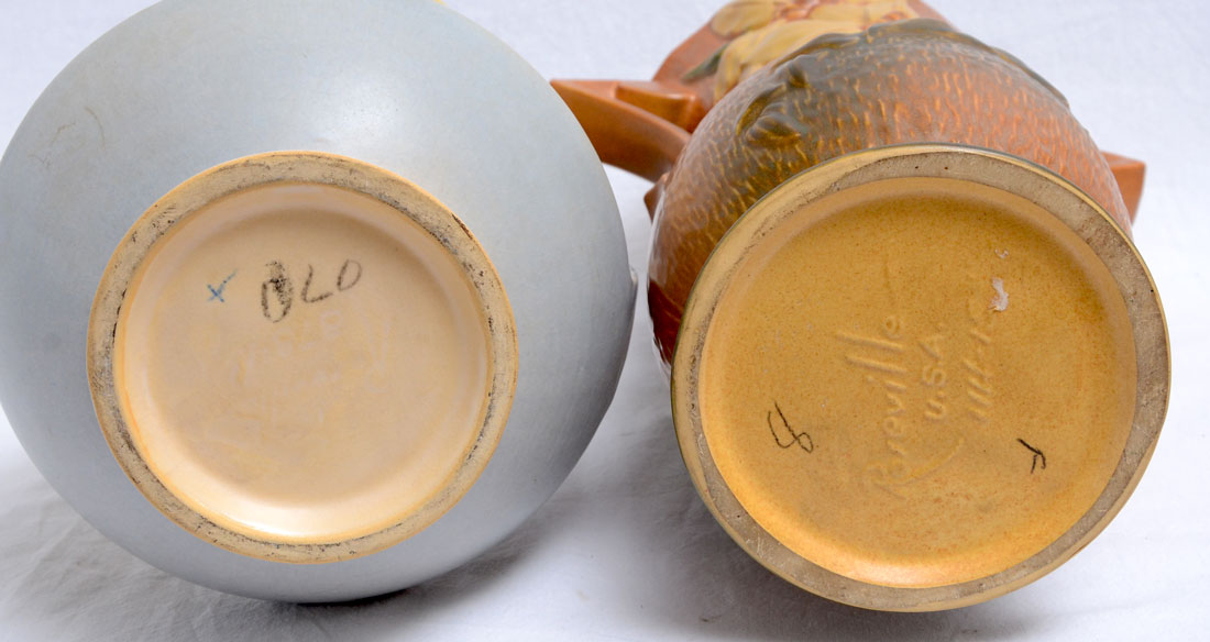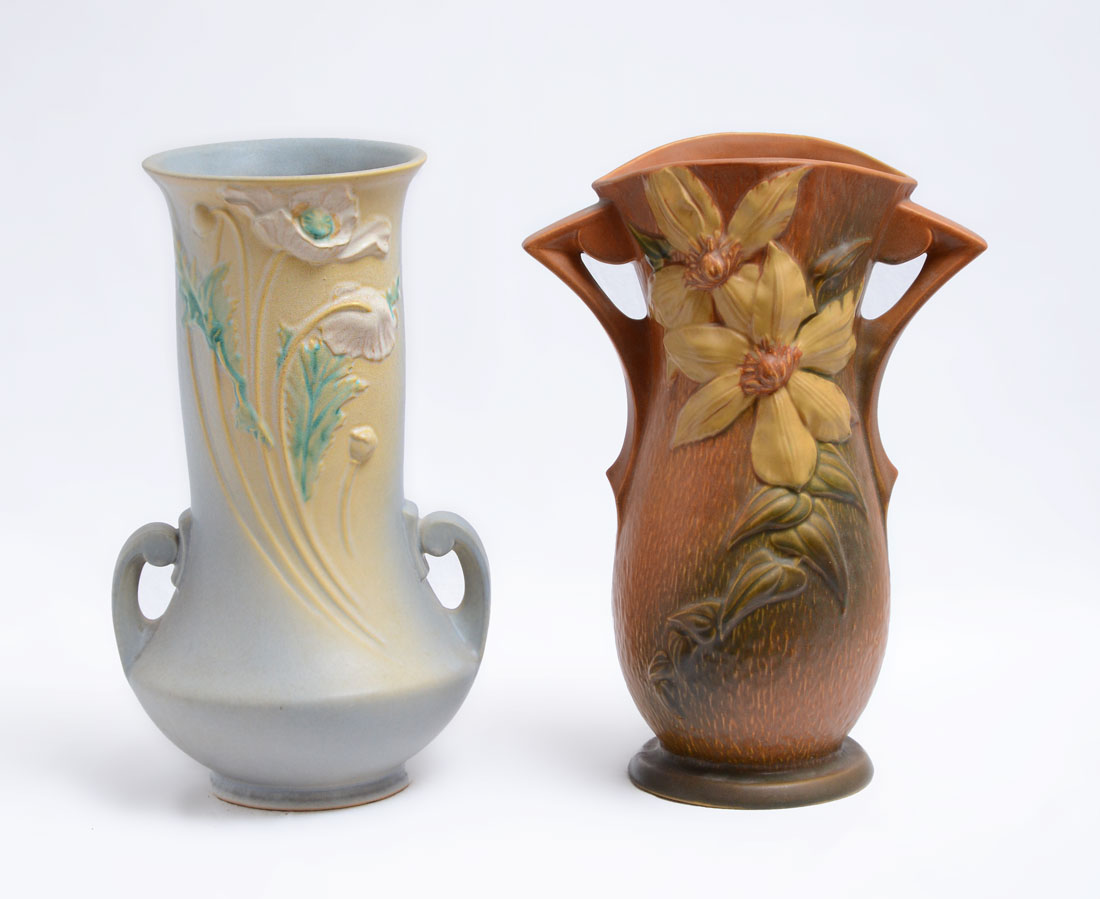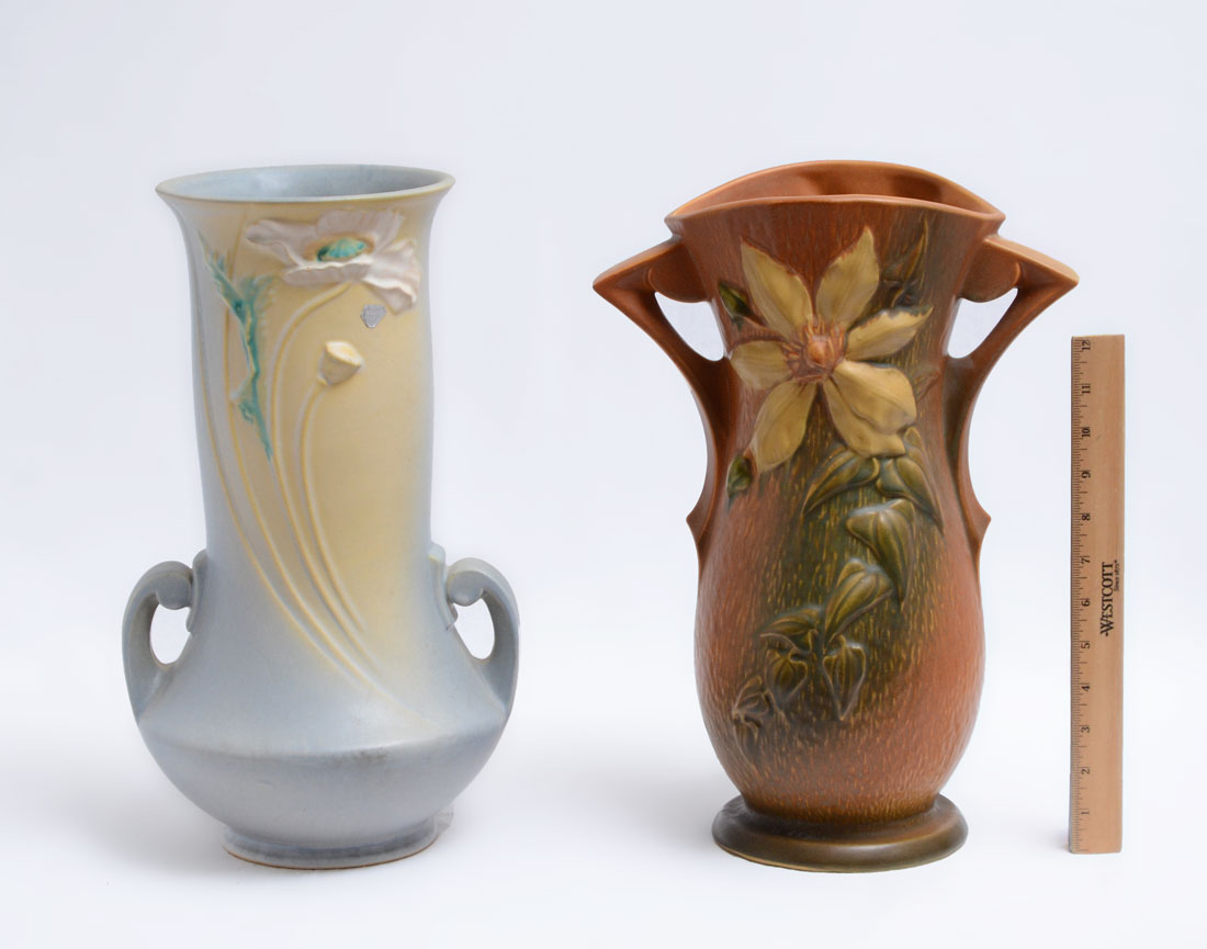 2 ROSEVILLE POTTERY TALL VASES POPPIES & CLEMATIS: 2 pieces total to include 1) Blue / yellow Poppies vase, foil sticker on side of body, 13 1/2'' h. x 9 1/2''. 2) Clematis brown 1111-15, overall 15 1/2'' h. x 11''.