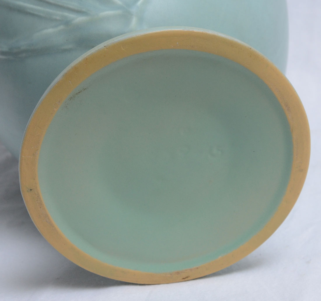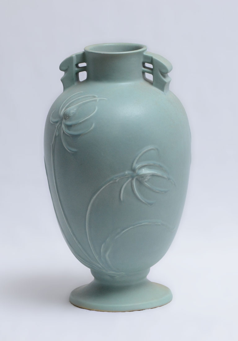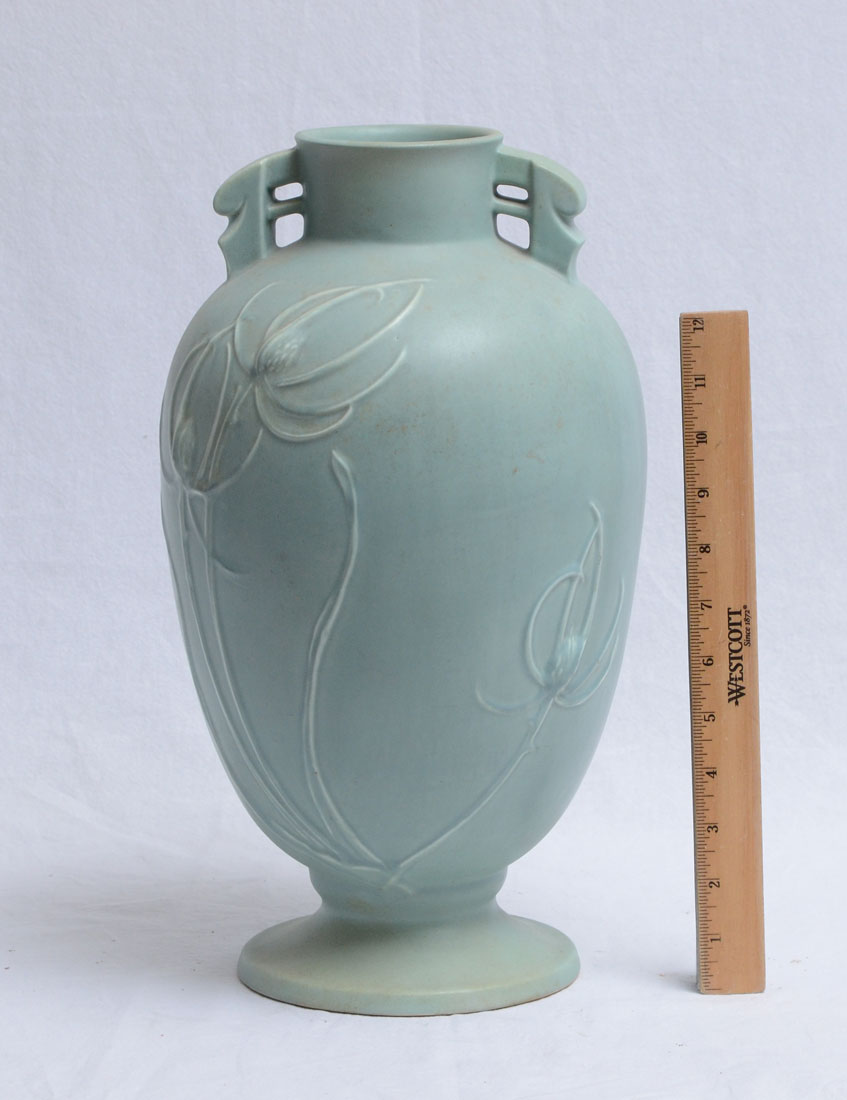 ROSEVILLE POTTERY TEASEL TALL VASE 889-15: Light blue thistle design, 15 1/4'' h. x 8 1/2''.