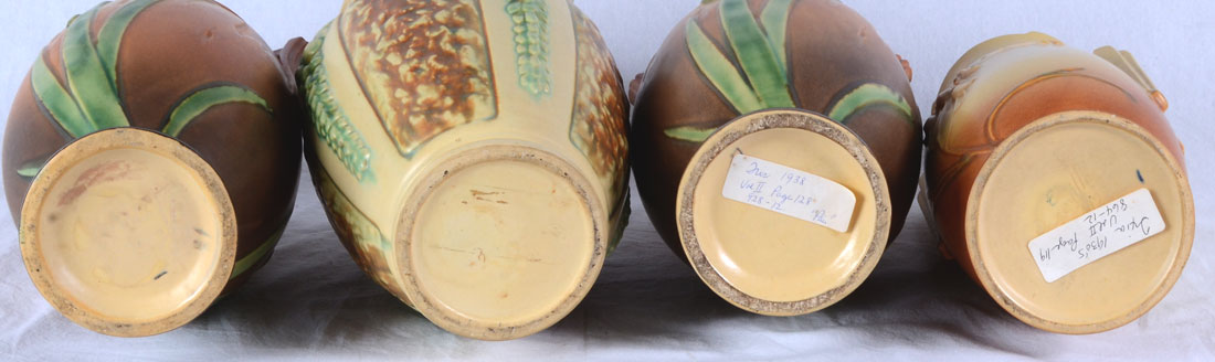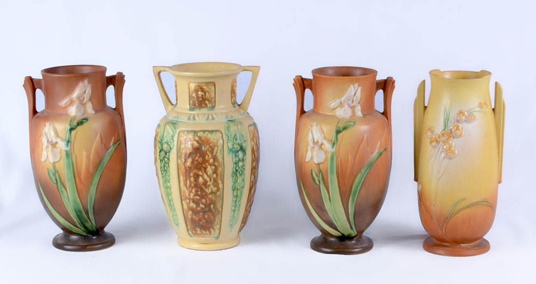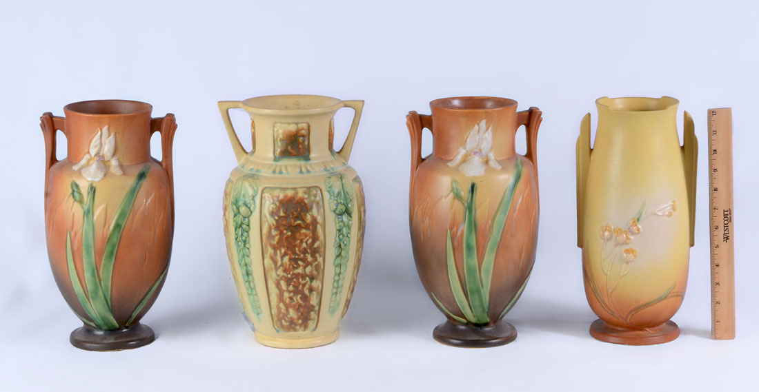 4 ROSEVILLE POTTERY VASES IRIS, IXIA, & FLORENTINE: 4piece total to include 1-2) Pair Iris 928-12, 12 1/2'' h. x 7''. 3) Ixia yellow, 864-12, 12 1/2'' h. x 6 1/2''. 4) Florentine 234-12, 12 1/2'' h. x 7 1/2''.