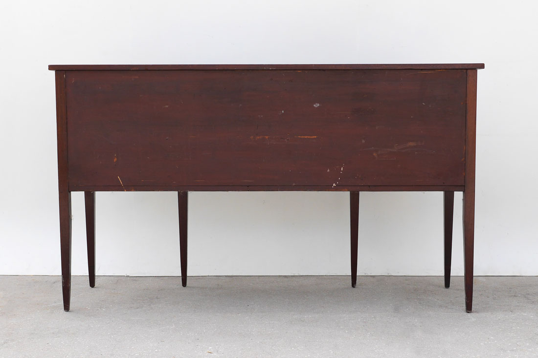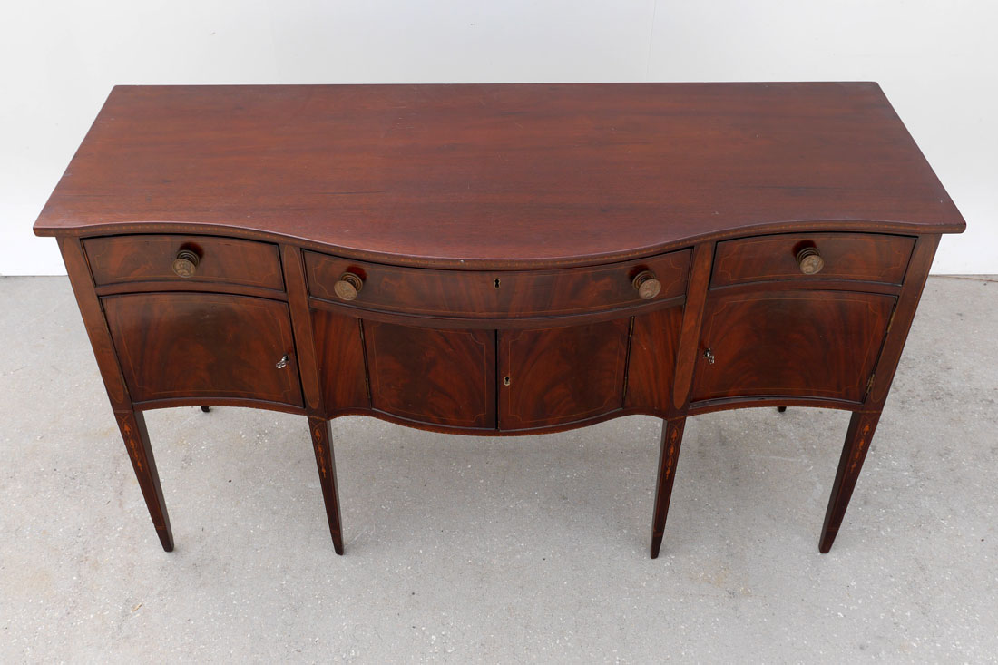 MAHOGANY INLAID HEPPLEWHITE SIDEBOARD: Serpentine top and front, top with inlaid band. 3 drawers over 4 doors with string inlay and brass knob pulls, tapered legs with bellflowers, overall 38'' h. x 65 1/2'' x 25 1/2''.
