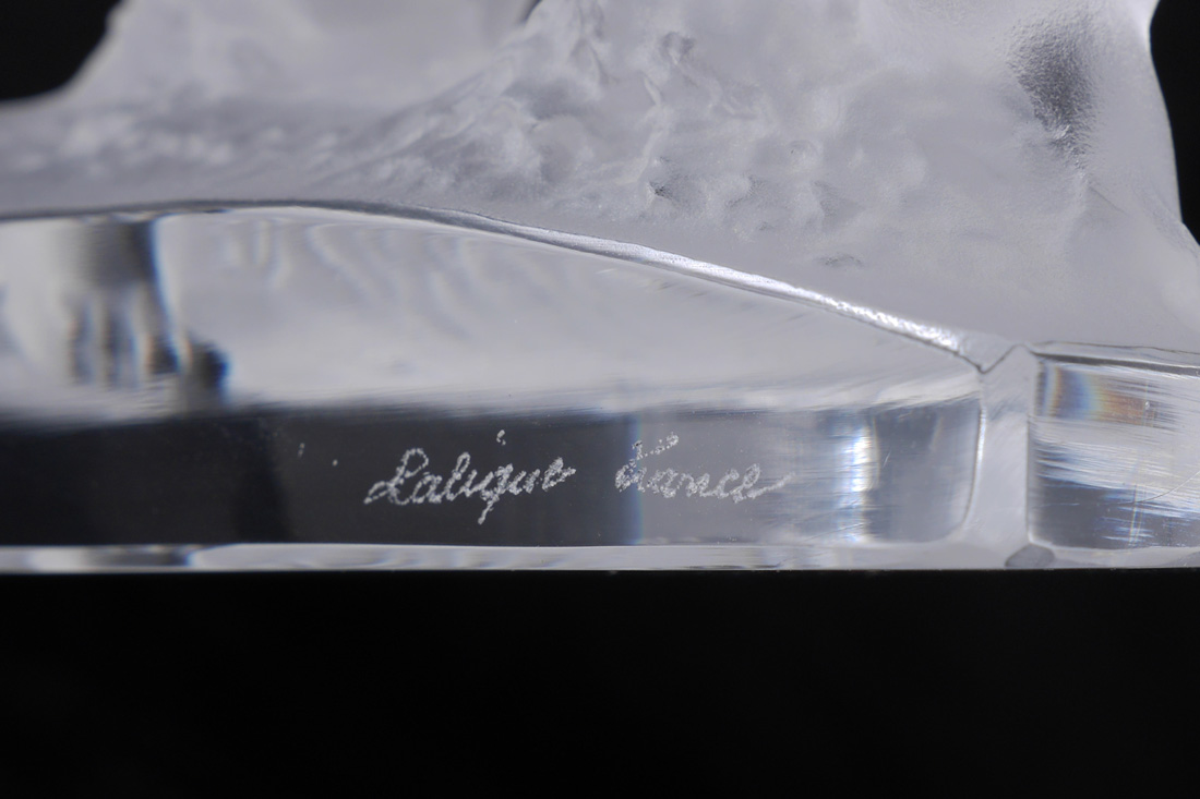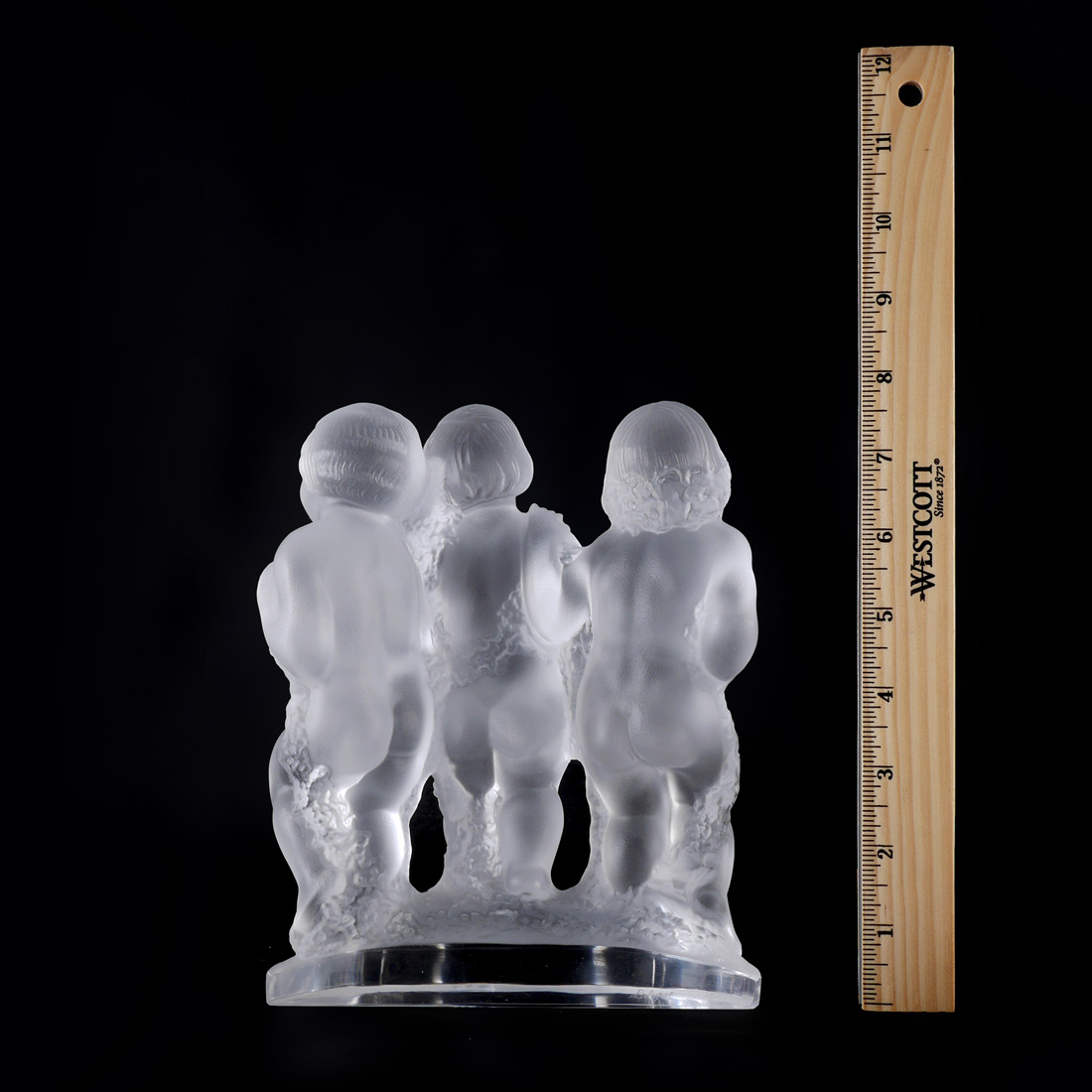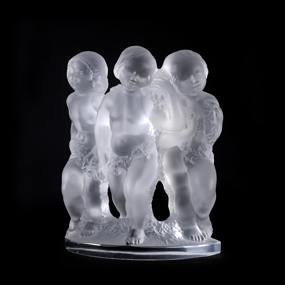 LALIQUE LUXEMBOURG PUTTI FIGURAL GROUP: Frosted and molded figure of 3 putti holding a garland, signed Lalique France, 7 3/4'' h. x 6 1/2'' x 3''.