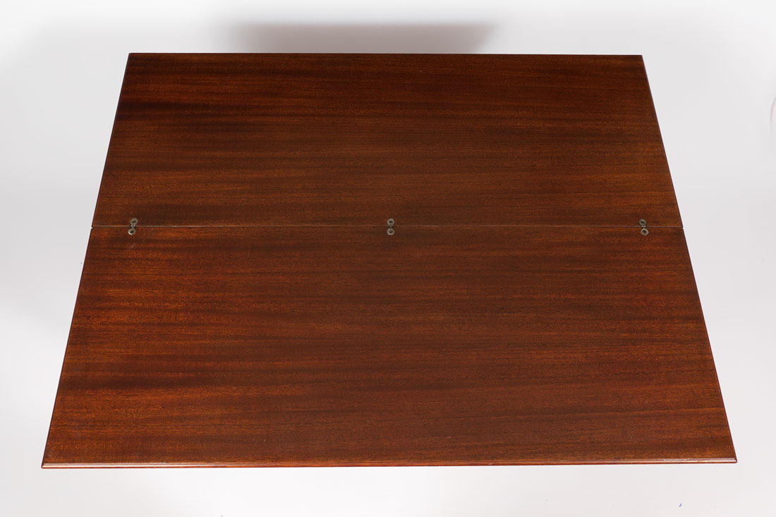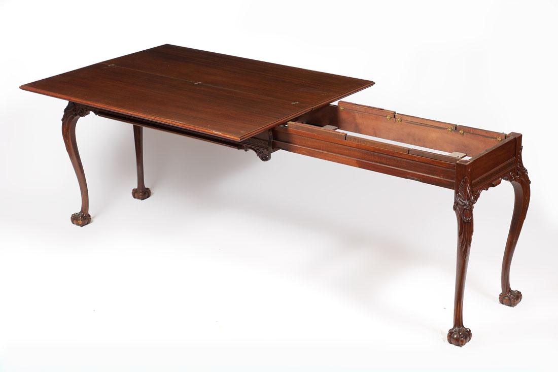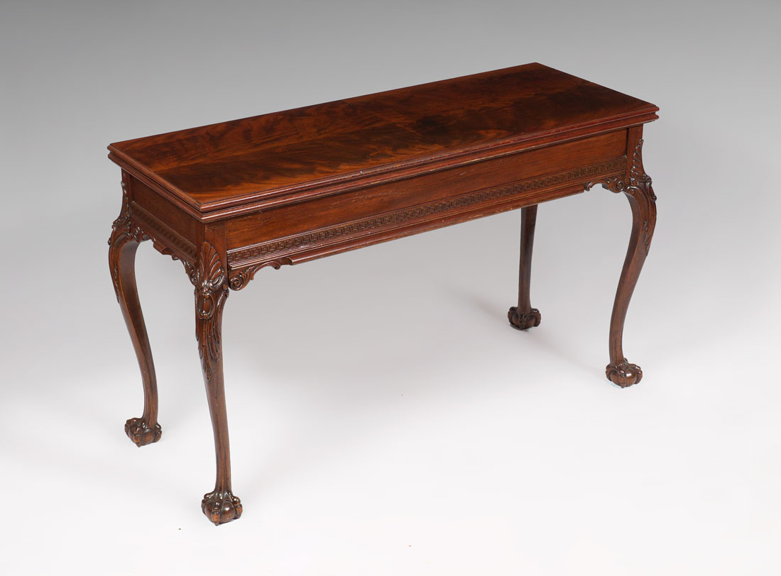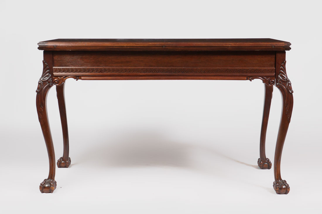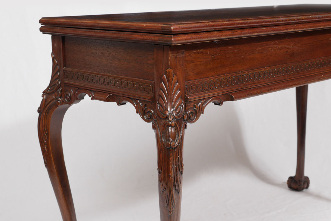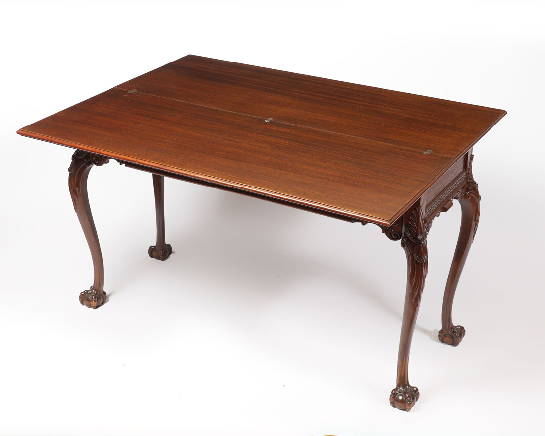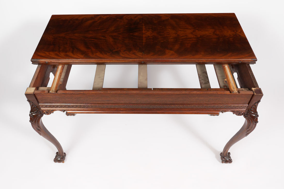 CHIPPENDALE STYLE MAHOGANY FLIP TOP PARLOR TABLE: Crotch mahogany veneer top slides and flips open, carved skirt, carved and shaped legs ending in claw and ball feet. 31'' h. x 50'' x 19 1/4'' closed.