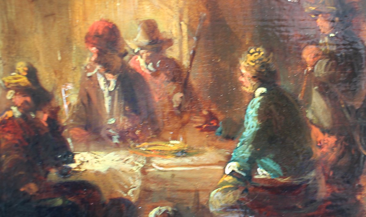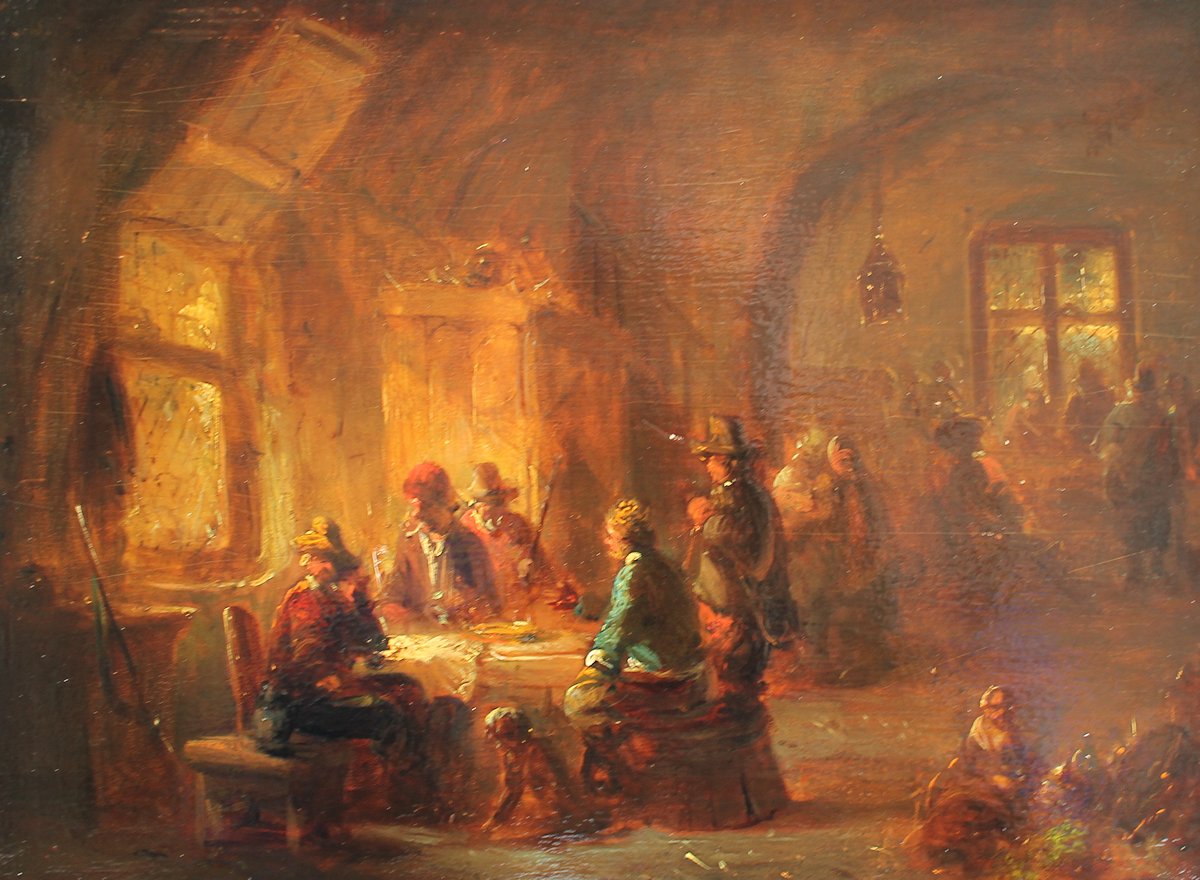 19th C. TAVERN INTERIOR PAINTING: Signed verso C. Bega, Oil/Wood Panel, 8.75'' x 11.75'', framed, 12.5'' x 15.5''.