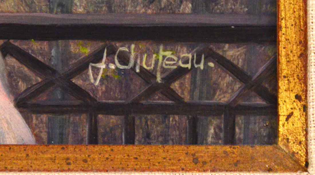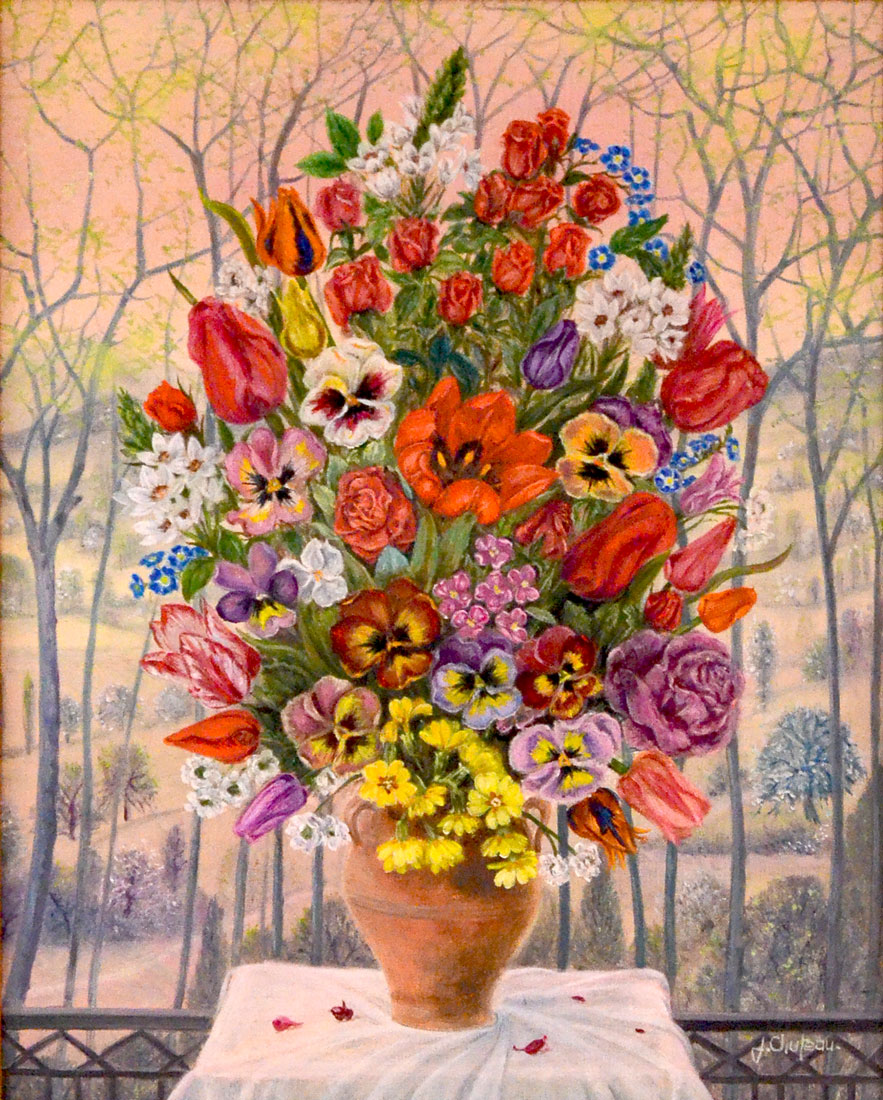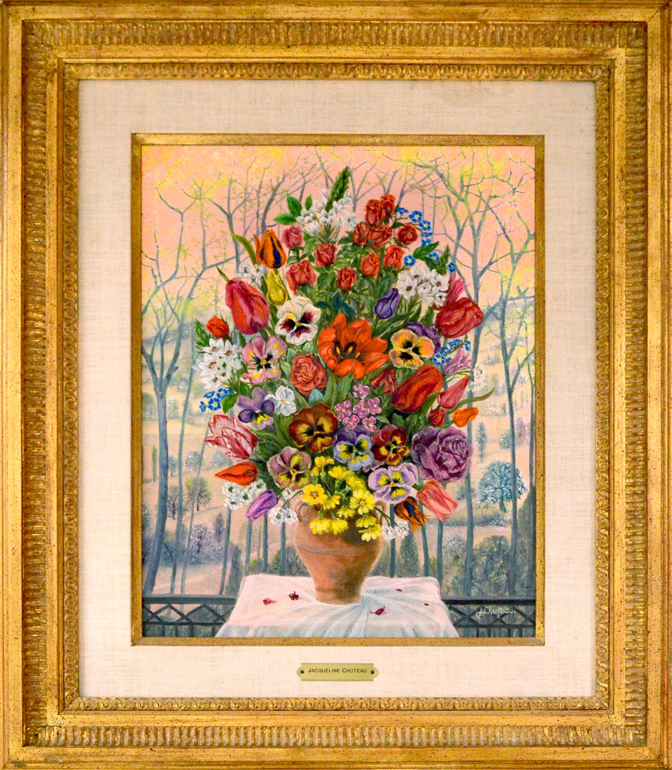 CHUTEAU, Jacqueline (1923-): ''Floral Still Life with Arrangement in Clay Pot and Patio with Forest in the Distance'', Oil/Board, sight size 15.50'' x 12.50'', signed lower right , encased in a Wally Findlay Gallery frame, 24.50'' x 21''
