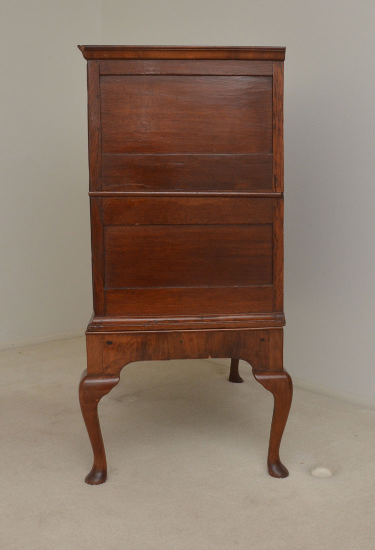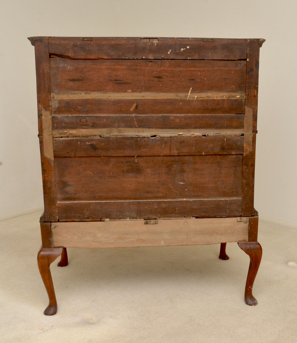 QUEEN ANN HIGH CHEST OF DRAWERS: Late 18th to early 19th century chest, 2 half drawers over 3 full length drawers, shaped skirt, Queen Anne legs, overall measures 48 3/4'' h. x 40'' x 28 1/4''.