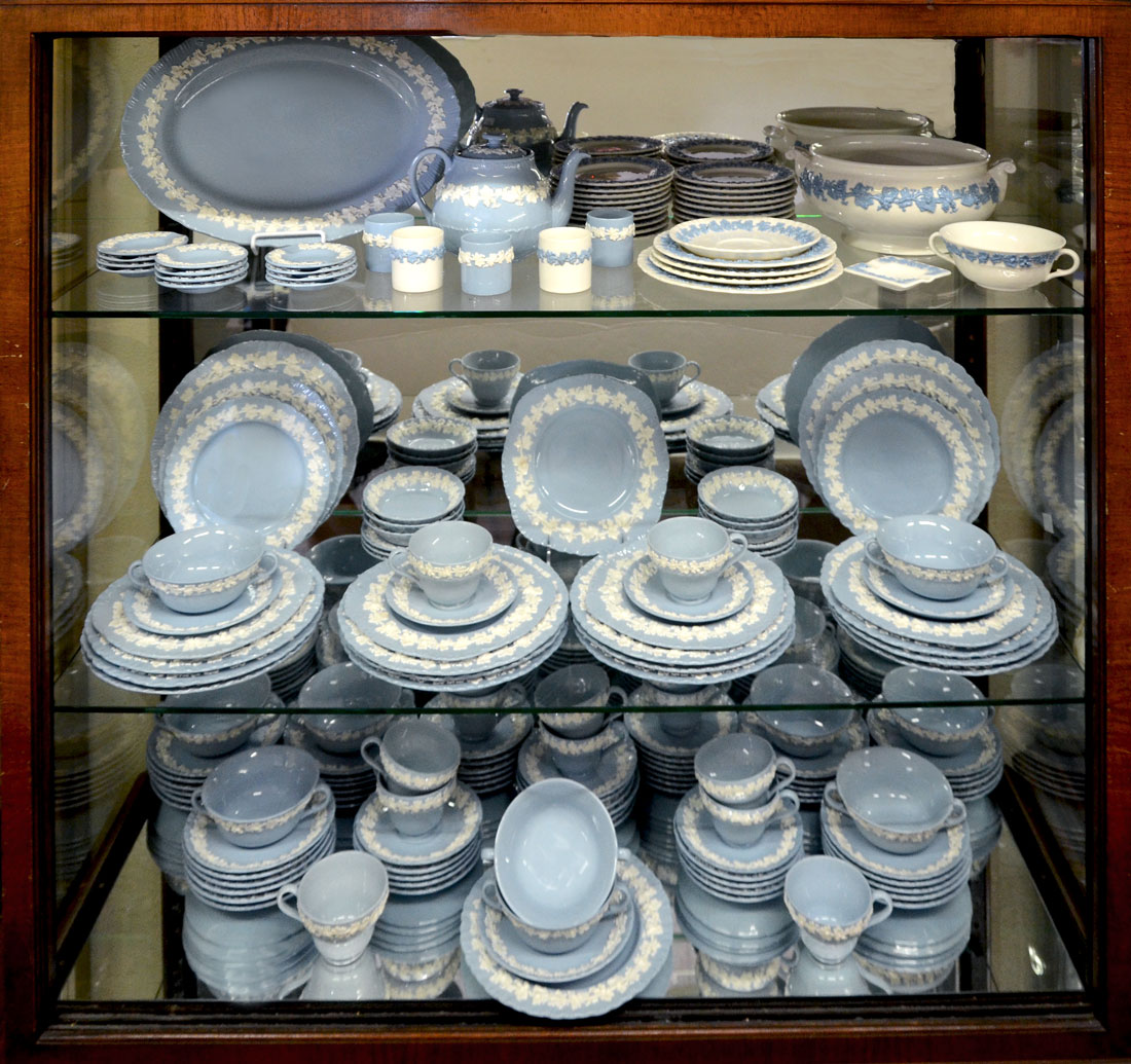 LARGE COLLECTION OF WEDGWOOD QUEEN'S WARE CHINA: An assembled collection of approx. 173 pieces in the embossed grape vine pattern, cream on lavender (pale blue) and lavender (pale blue) on cream. Cream on lavender to include 14 dinner plates (10 1/2''), 3 luncheon plates (9 1/8''), 2 salad plates (8''), 5 square luncheon plates (8 1/2''), 10 handled soup bowls, 36 underplates (6 3/4''), 14 teacups, 31 saucers (5 3/4''), 6 saucers (5 1/8''), 6 low bowl (5 1/8''), 12 ashtrays (3 3/4''), 3 small cups, oval platter (12 1/2'' x 16 1/4''), teapot and lid (5 3/4''). Lavender on cream to include luncheon plate (9 1/8''), salad plate (8''), 19 bread plates (6 1/4''), handled soup bowl, underplate (6 3/4''), square ashtray, 2 small cups, open tureen (11 1/4'').