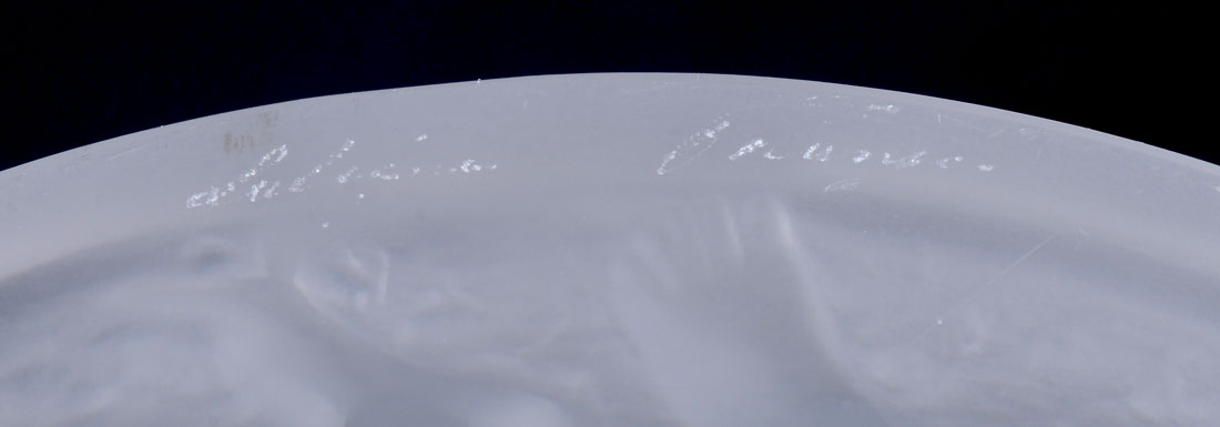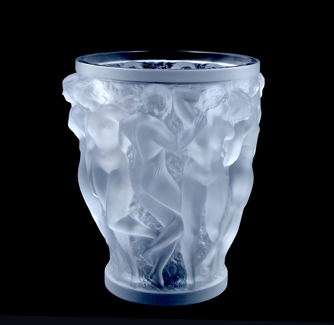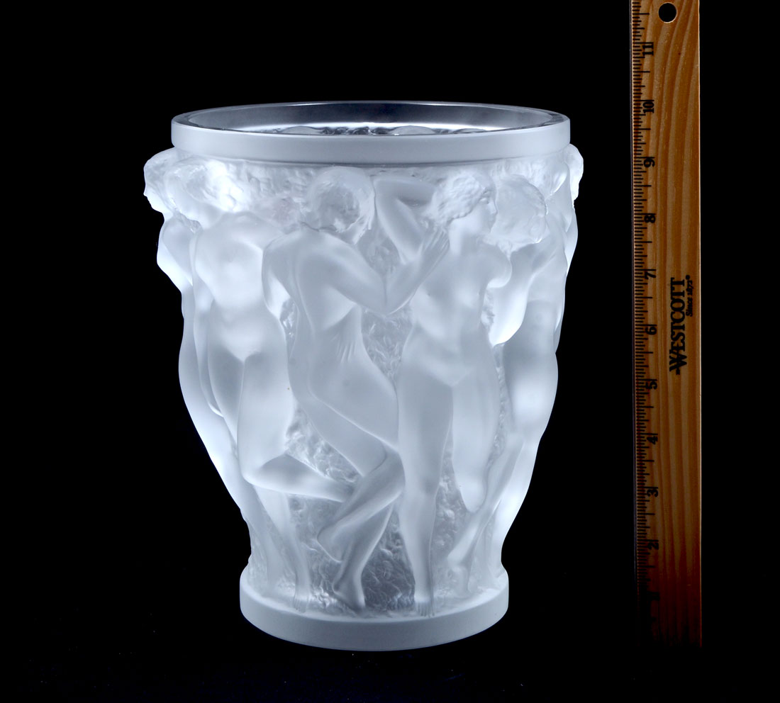 LALIQUE FROSTED BACCHANTES VASE: Frosted body with molded high relief figural nude women, signed Lalique France, 9 1/2'' h. x 8 1/2''.
