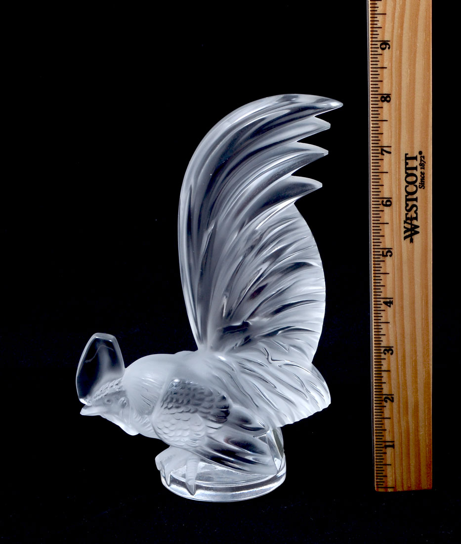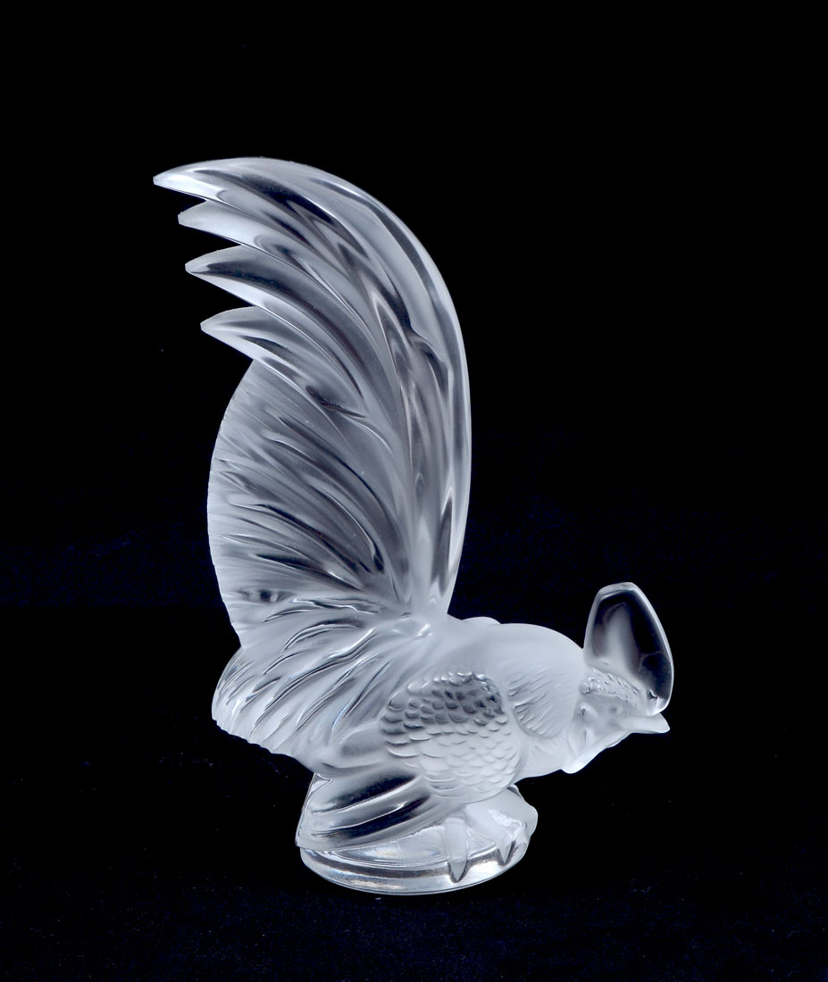 LALIQUE CRYSTAL COQ NAIN CAR MASCOT / PAPERWEIGHT: Frosted crystal figure of a rooster, signed Lalique France, original label, measures 8 1/4'' h. x 6''.