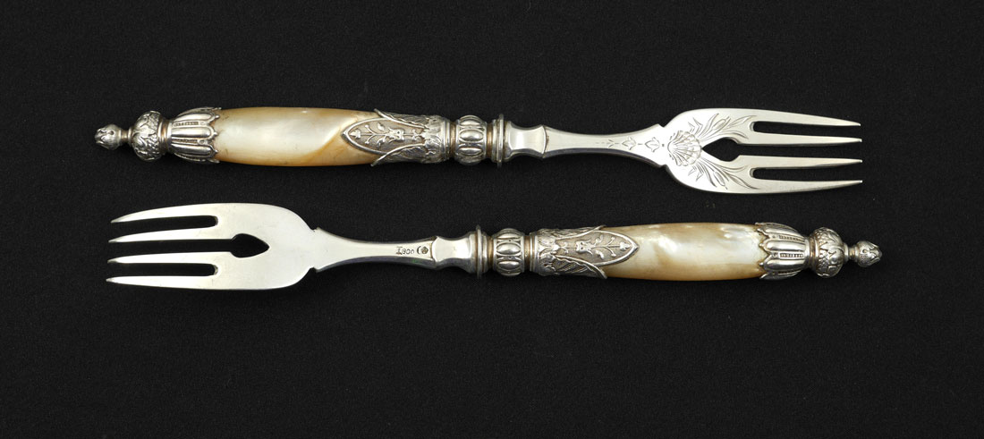 6 KOCH & BERGFELD 800 SILVER FORKS: 6 pieces total by German maker Koch & Bergfeld with faux mother of pearl handles, engraved tines, 7 1/2'' long.