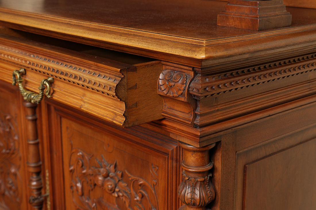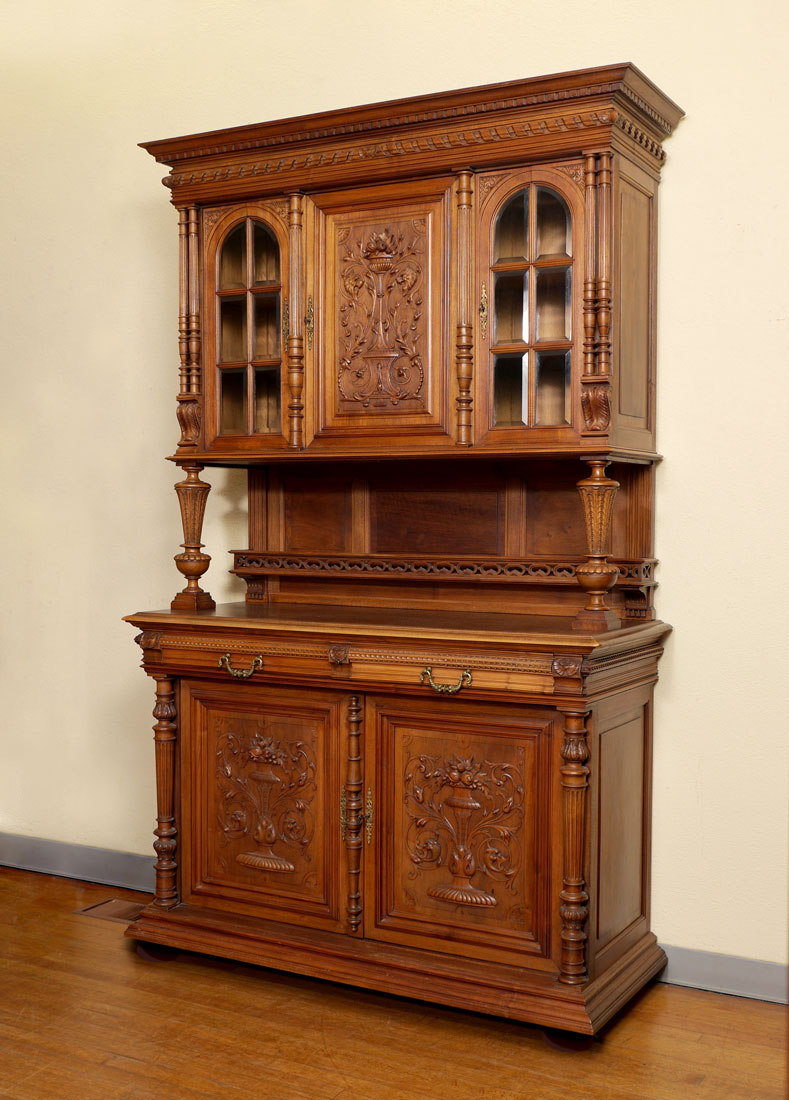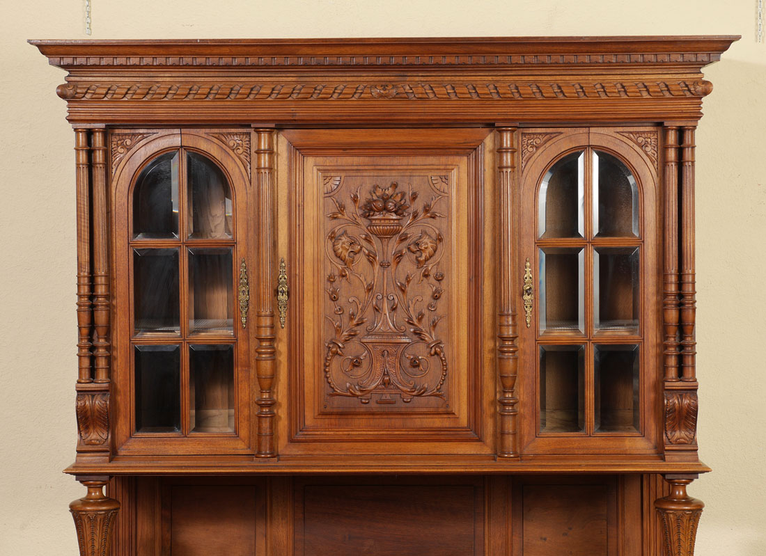 19TH CENTURY ENGLISH CARVED WALNUT CUPBOARD: Top with central carved front door with masqueron and foliate motifs, 6 light glass door either side, backsplash with pierced gallery carved supports. Base with s drawers of 2 doors with matching carved fronts, fluted half column stiles. Overall 91 1/2'' h. x 55'' x 22 3/4''.