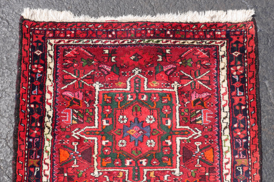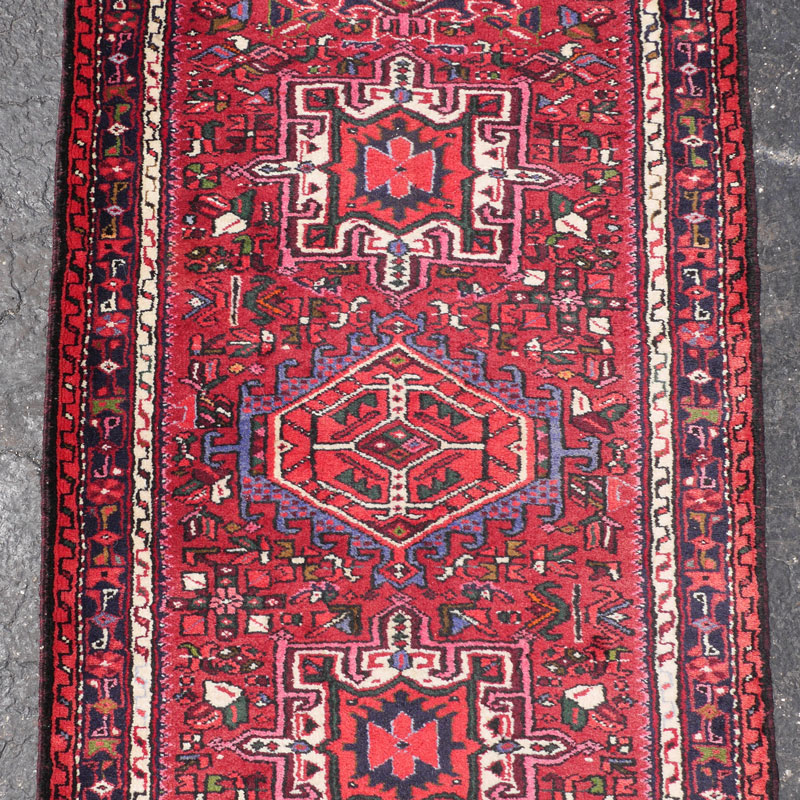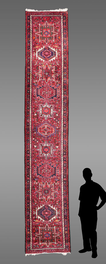 APPROX 20-40 YR OLD PERSIAN KARAJA HAND KNOTTED WOOL RUNNER, 3'2'' X 16': This long runner has the traditional design of a weaving from Karaja. A row of different geometric shaped medallions runs down the center of the brick red field. The medallions and the field itself are all outlined in white. This accentuates both the designs and the other colors used. These colors include blue, pink, black, green, and yellow.