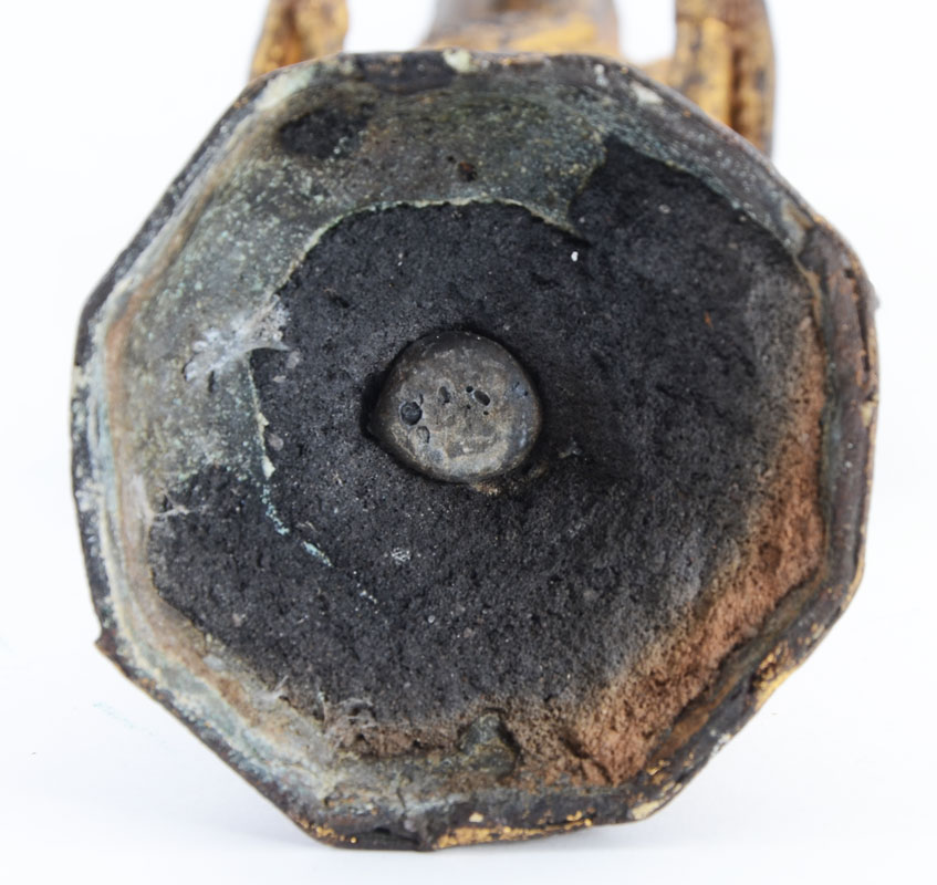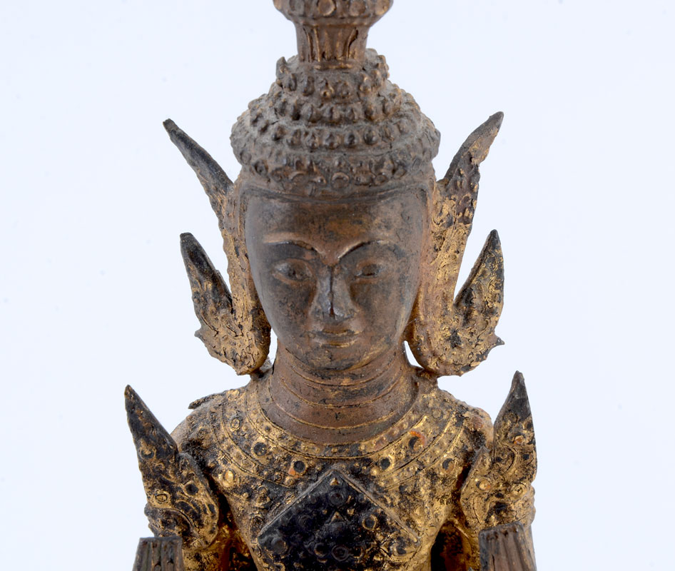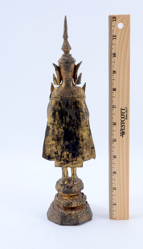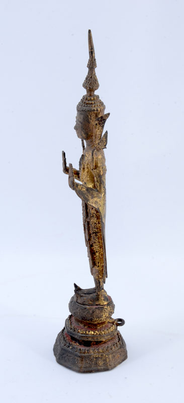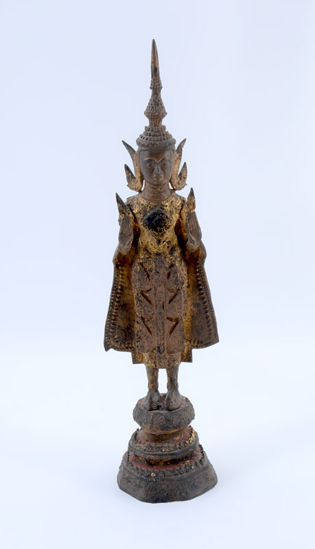 THAI GILT BRONZE STANDING BUDDHA: Cast gilded bronze figure of a standing Buddha with upright hands in abhaya mudra, on 3 tier base with red accent paint. Overall measures 12 1/4'' h. x 3 1/4''.