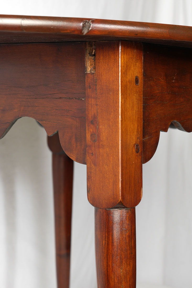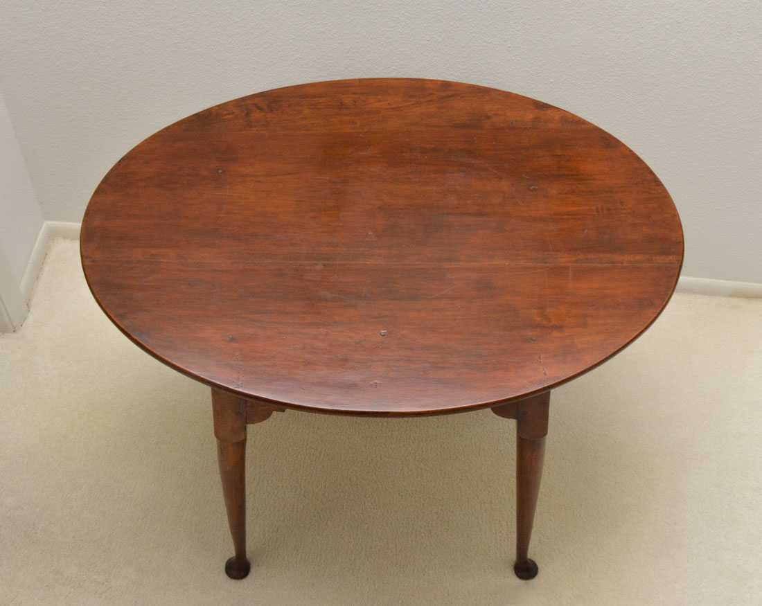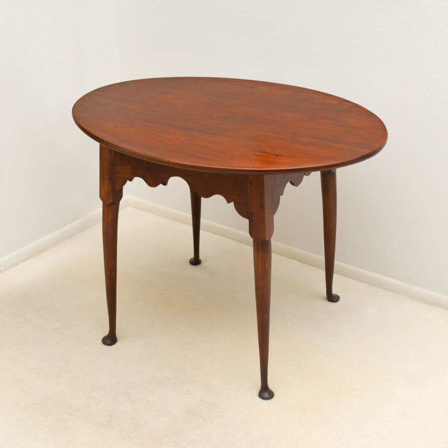 18TH CENTURY QUEEN ANNE TEA TABLE: Late 18th to early 19th century, oval 2 board top, shaped skirt, turned tapered round legs ending in pad feet. Overall measures 27'' x 35 1/2'' x 25 1/4.