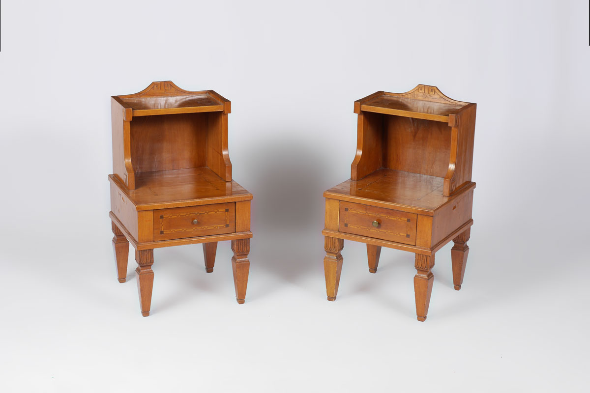 2 BIEDERMEIER END TABLES / NIGHT STANDS: Shaped top gallery over open shelf, supports with Greek key motif. Parquetry inlaid top over single drawer with matching design. Carved and tapered legs, 27 1/2'' h. x 15 1/2'' x 15''.