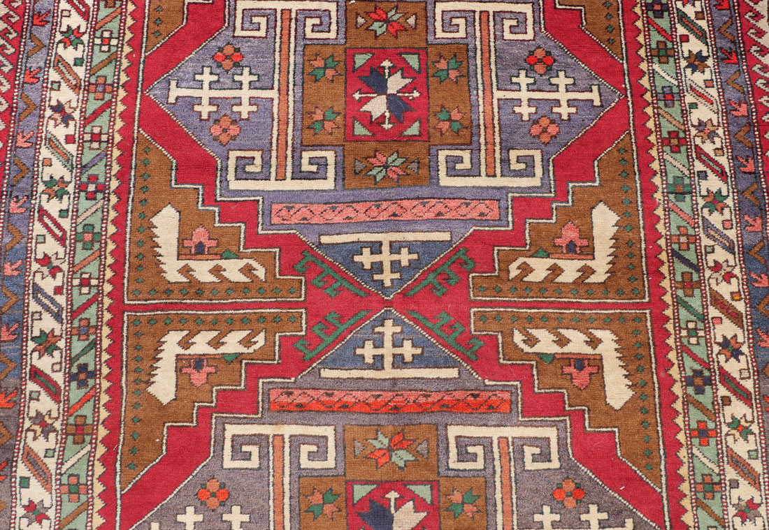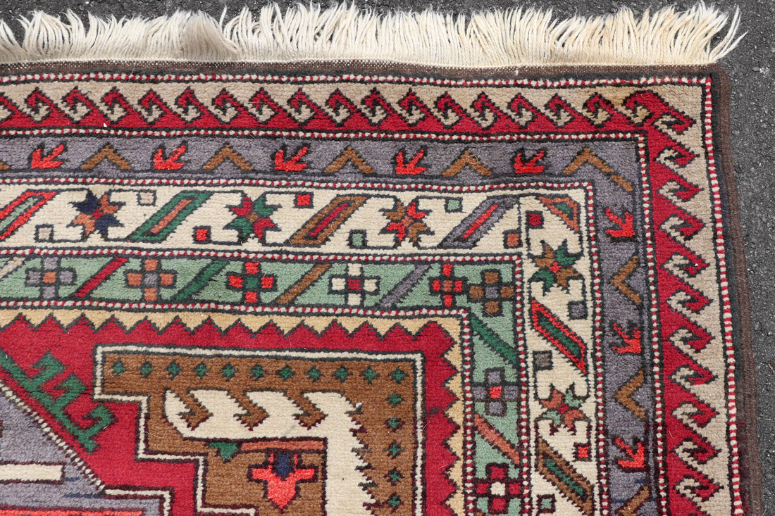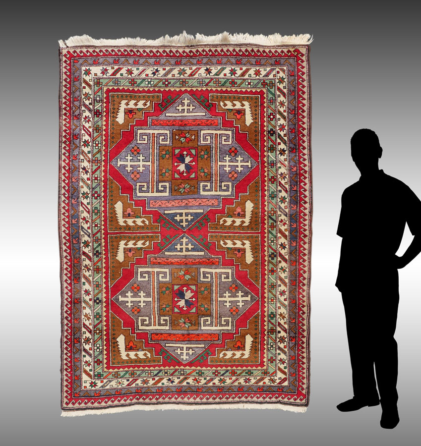 APPROX 20-45 YR OLD TURKISH CAUCASIAN DESIGN HAND KNOTTED WOOL RUG, 4'11'' X 6'9'': This Turkish rug has a Caucasian Kazak design. The two diamond-shaped central medallions have giant ''I's'' as part of their design. An ''L'' shaped corner design is found not only in the corners but also on the center sides of the field so both medallions are flanked by them. The borders have three archaic Caucasian designs, the running dog, leaf and star, and leaf and flower motifs.