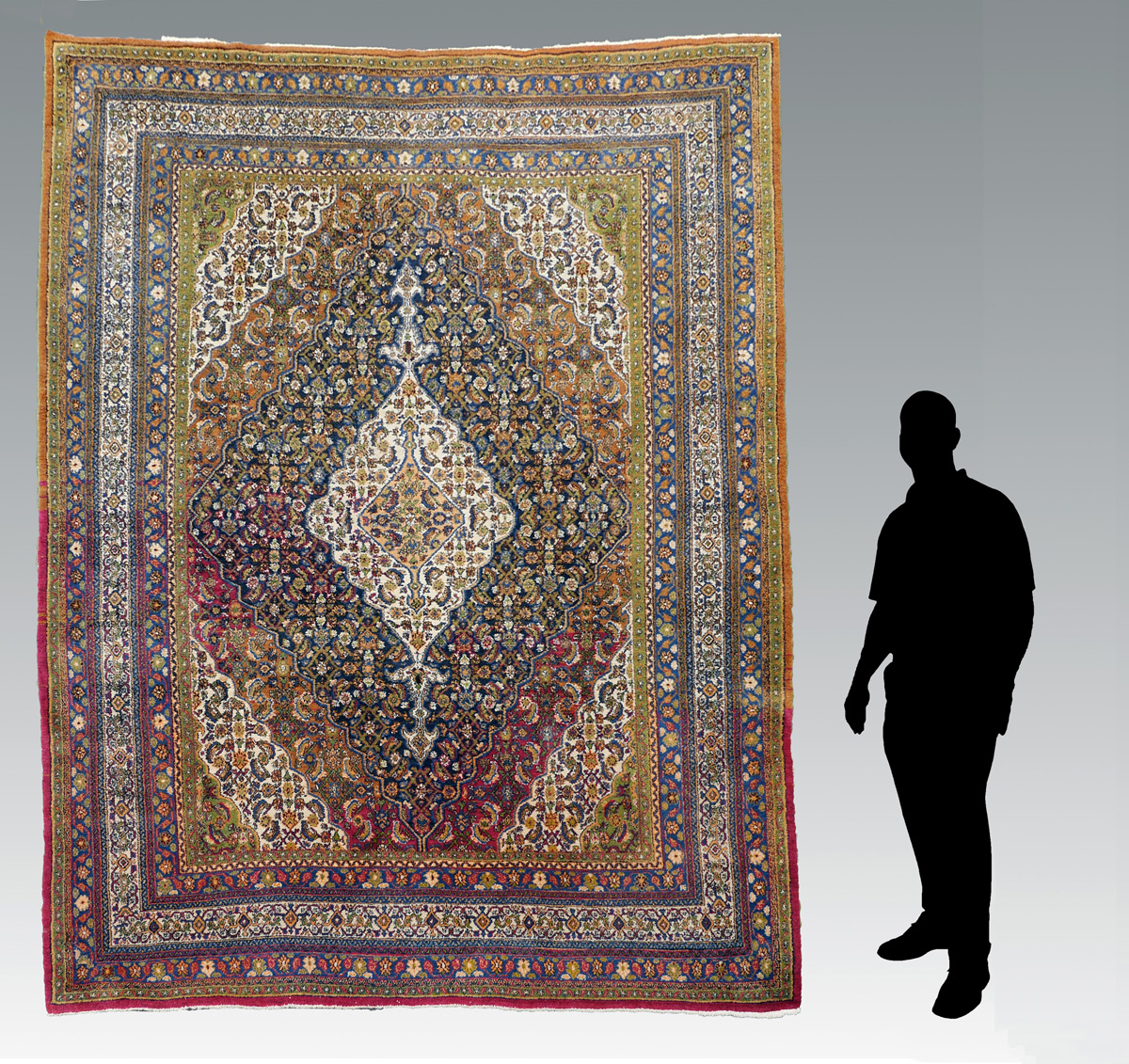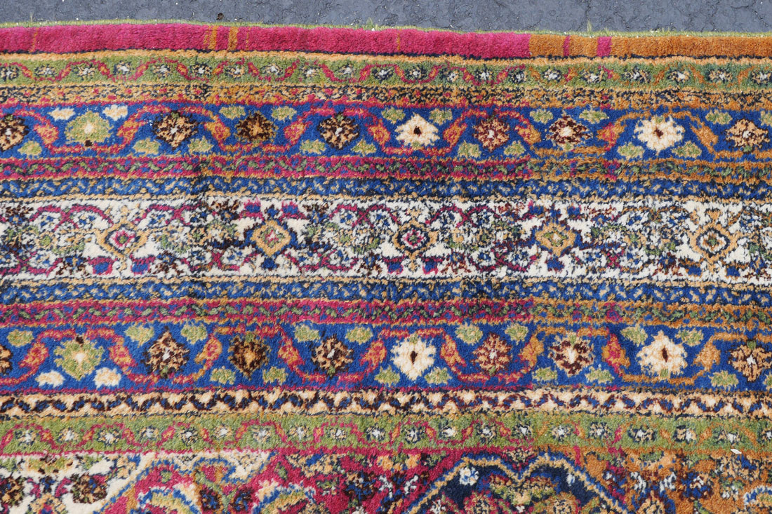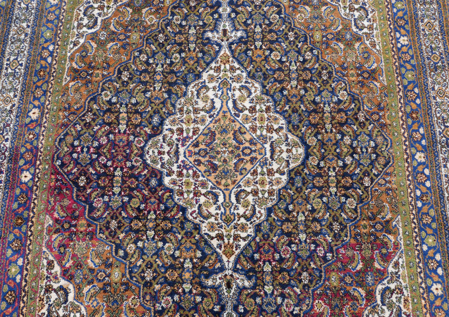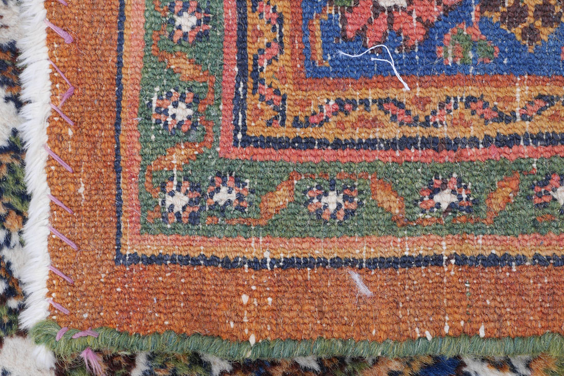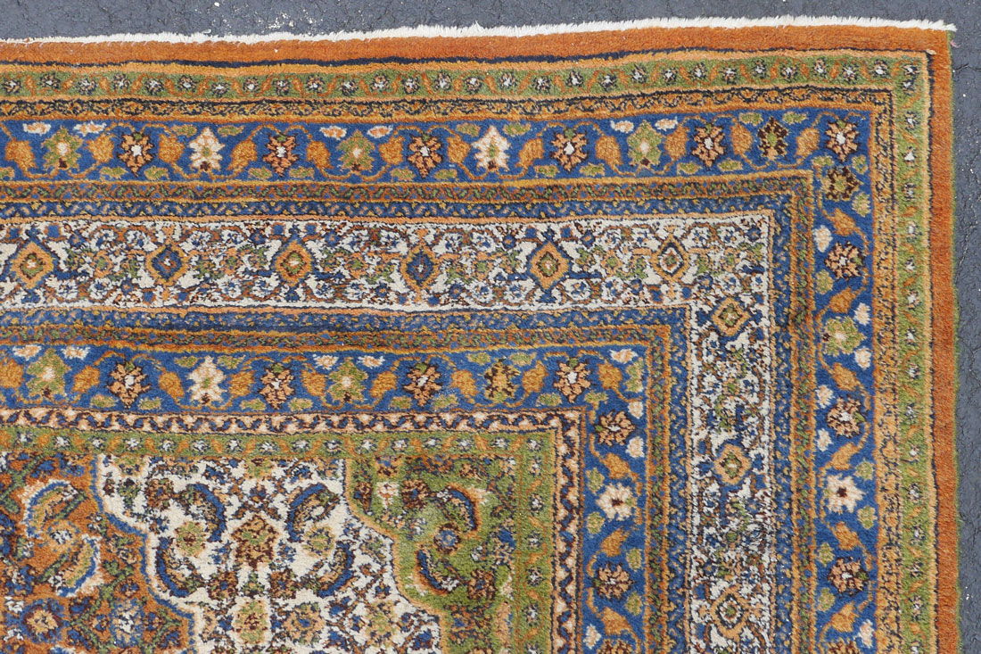 SEMI-ANTIQUE PERSIAN HAND KNOTTED WOOL RUG, 9'X12': This interesting rug has an overall design of diamond shapes starting with the white central medallion, then a blue ground diamond then a red and orange (this diamond has color change from one end and even one side from another). At the outside are the white and green corners that keep up the diagonal diamond look. Within all the diamonds is a small repeating Herati variant pattern. A green inner border starts the frame of the field and the several blue, white, red/orange, and green borders complete the design.