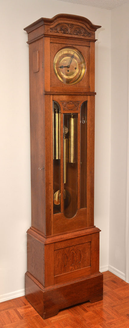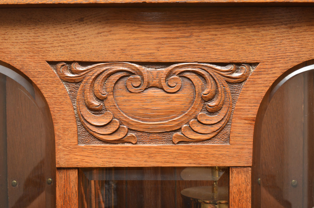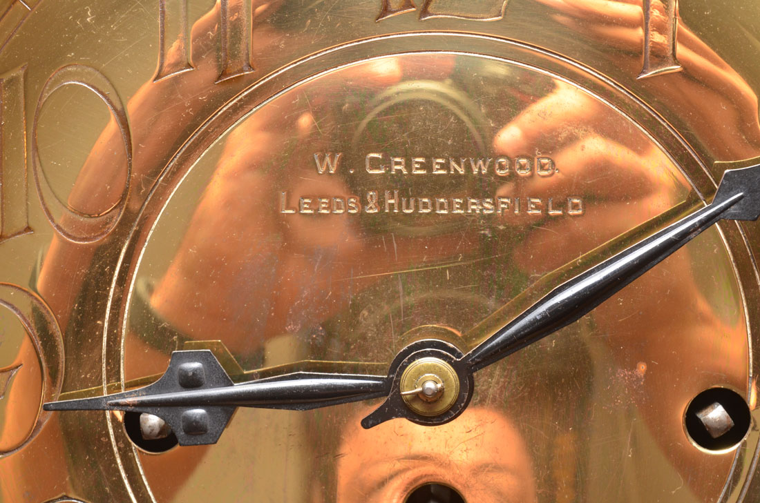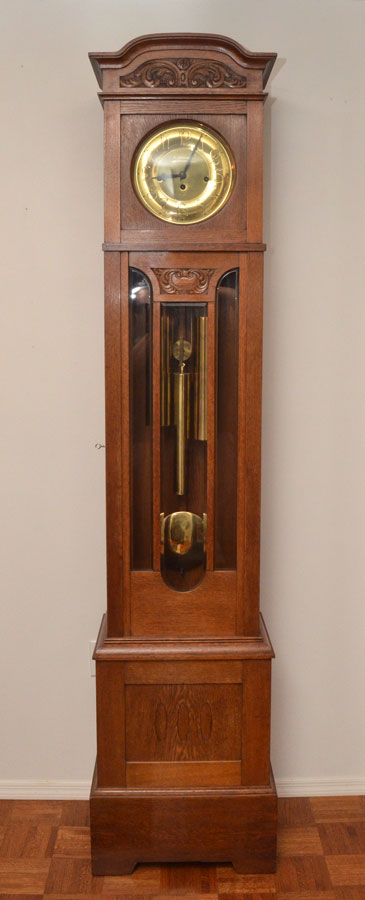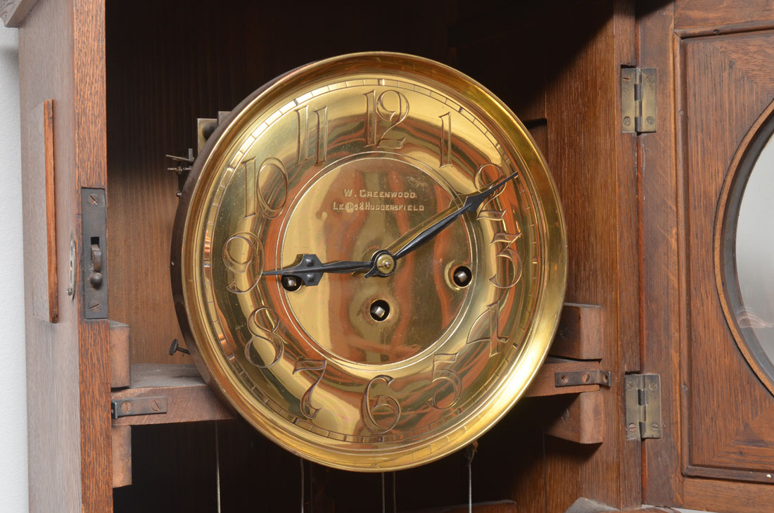 ENGLISH DECO OAK GRANDFATHER CLOCK: Early to mid 20th century oak case with carved crest, center door with 3 beveled glass panels, stepped base with carved oval decoration. Brass dial reads W. Greenwood, Leeds, & Huddlesfield, Arabic numerals, double gong strike. Overall measures 87'' h. x 19 3/4'' x 13 1/4''.