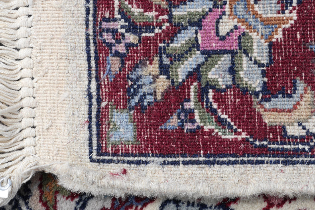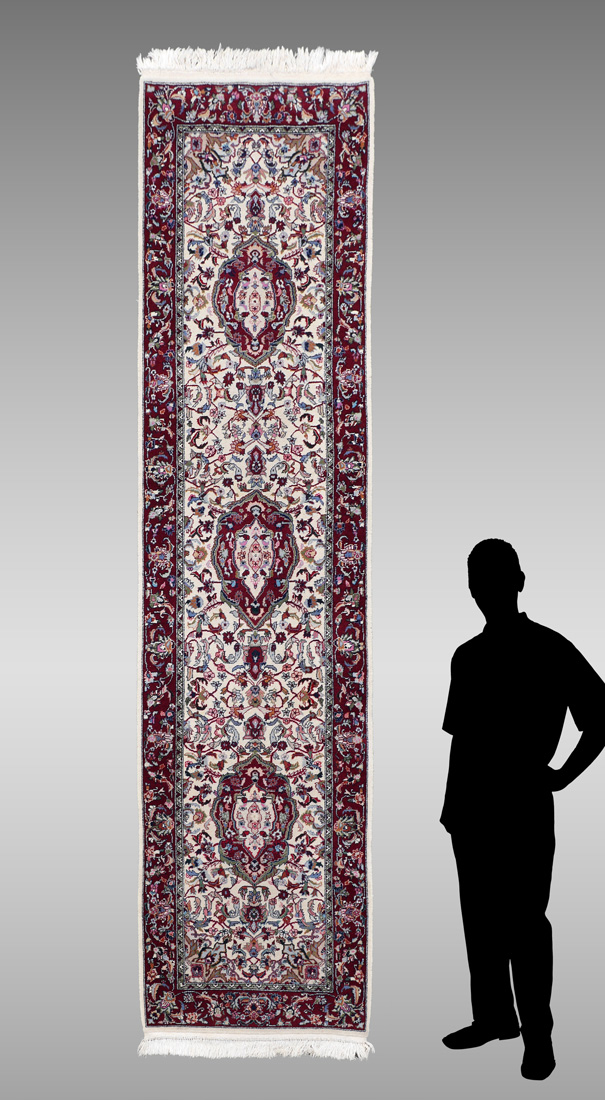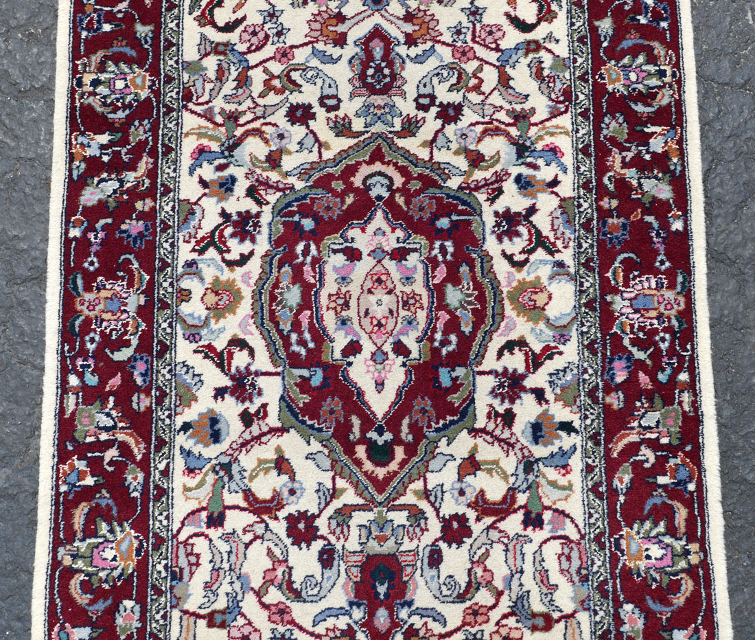 APPROX 20-40 YR OLD INDO-PERSIAN HAND KNOTTED WOOL RUNNER, 2'7'' X 10'1'': The white colored ground of this runner has three cranberry with white center colored medallions with spandrels running the length of the field. The balance of the field is covered with flowers and leaves linked by vines done in the cranberry and white as well as pinks, beige, and blues. The cranberry colored main border frames the field.