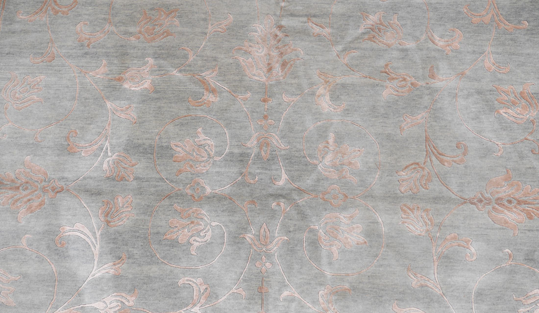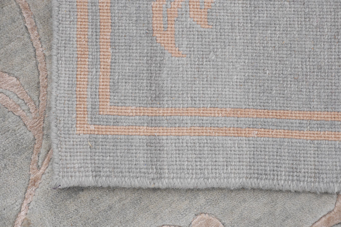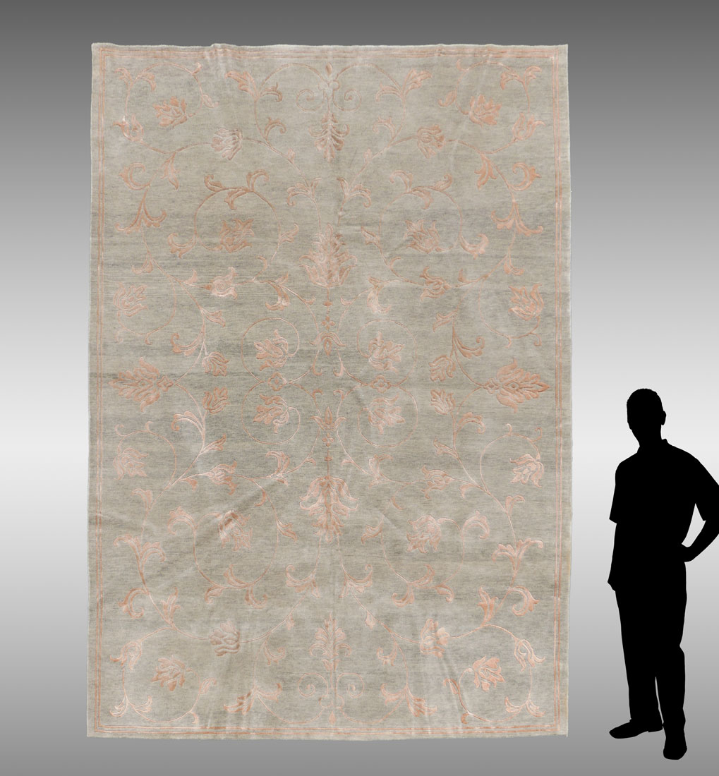APPROX 20-40 YR OLD CHINESE HAND KNOTTED WOOL RUG WITH SILK HIGHLIGHTS, 8'1'' X 11': The soft green field of this rug has a simple large format with a design of flowers and leaves on sinuous vines. The motifs are of an ivory colored silk and two ivory silk bands form the borders of the rug.