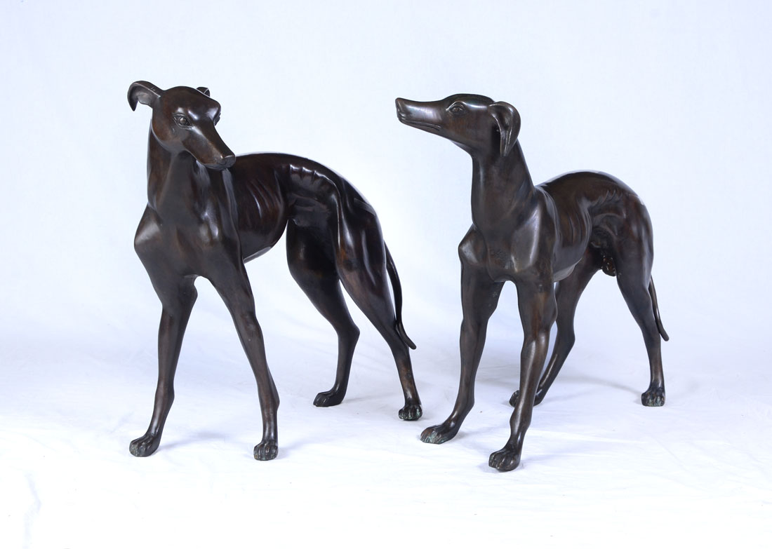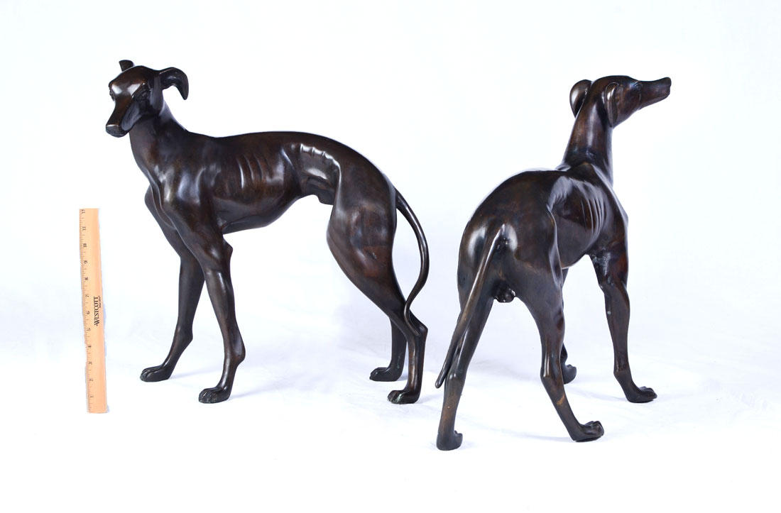 PAIR OF BRONZE WHIPPET DOGS: 20th century production, unmarked as to artist or maker. Each dog in slightly different standing position, larger 21 1/2'' h. x 19 1/2'' x 9 3/4''.