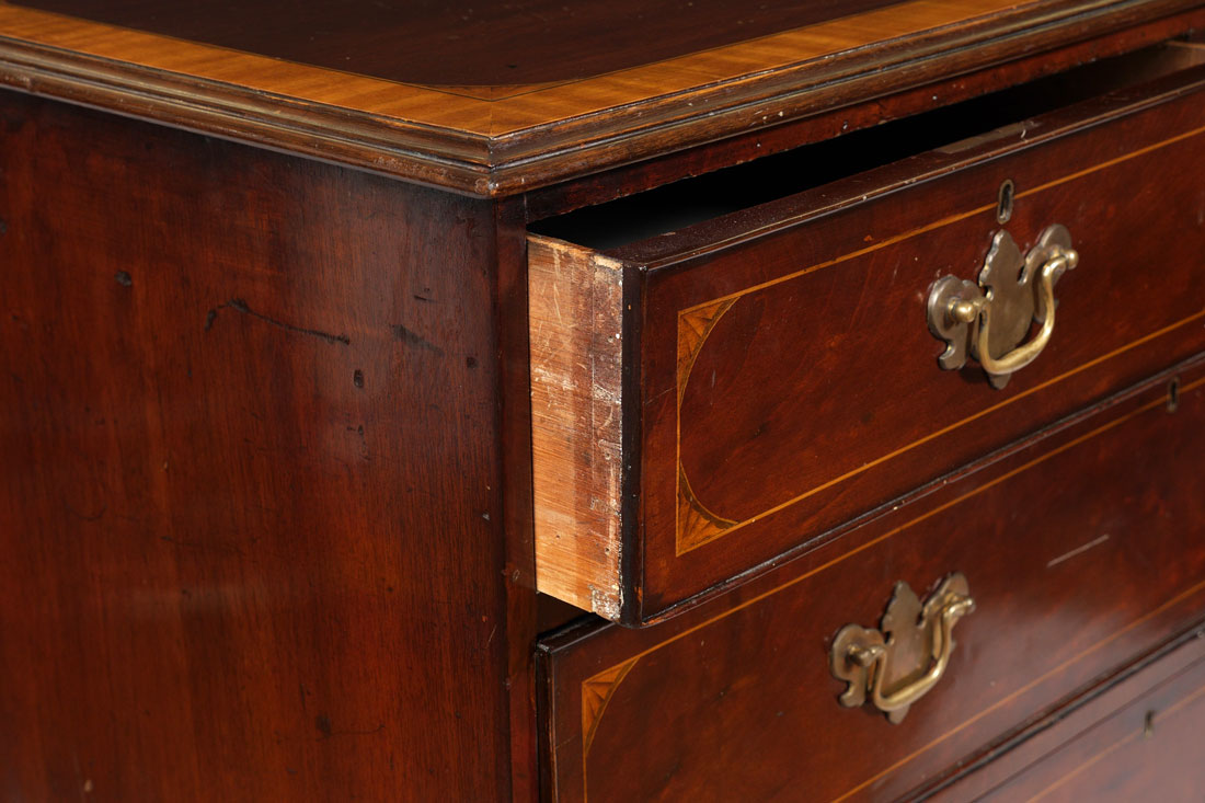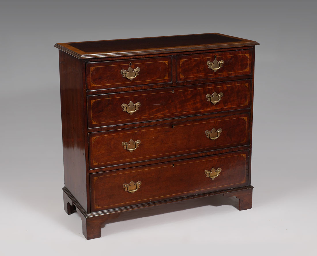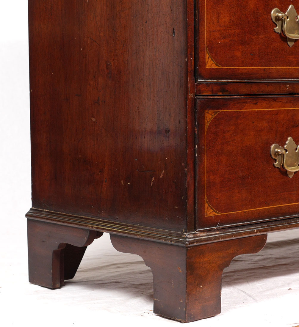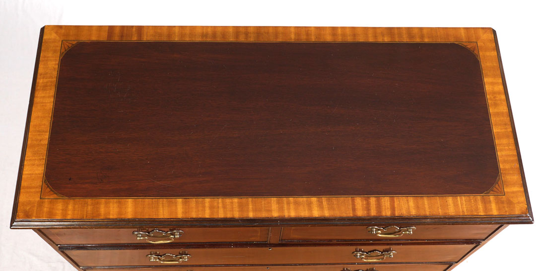 5 DRAWER ENGLISH MAHOGANY INLAID CHEST: Banded mahogany top with inlaid shell decoration at corners, 2 half drawers over 3 full length drawers, fronts with inlaid borders, brass batwing pulls, bracket feet. Overall measures 40'' h. x 42'' x 19''.