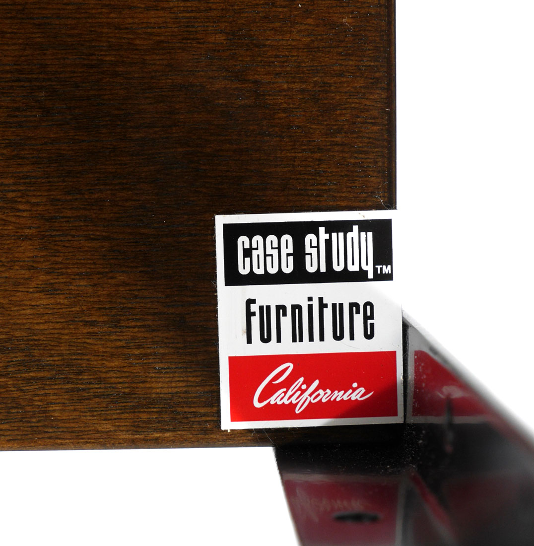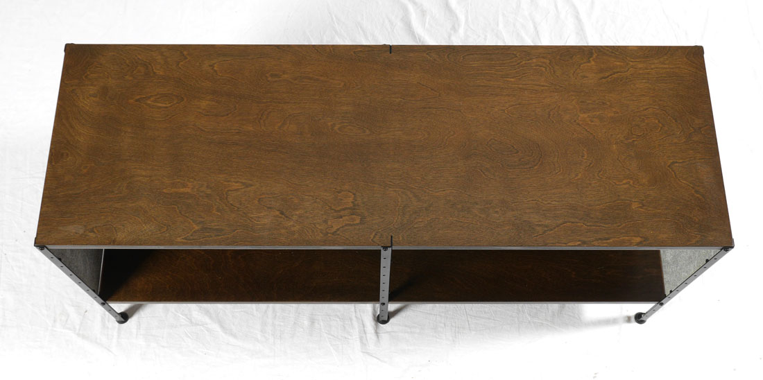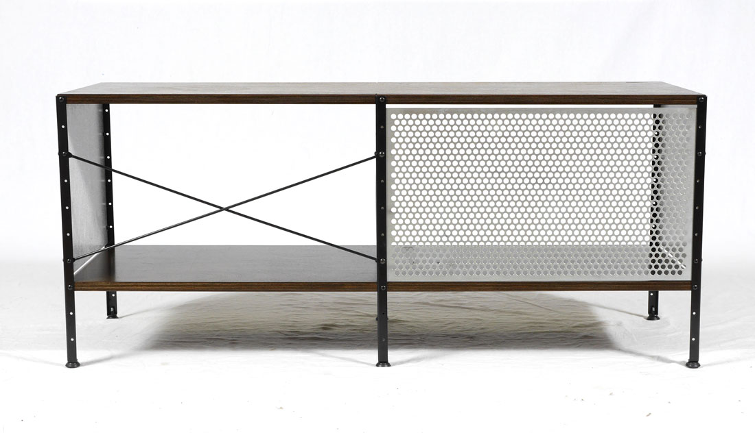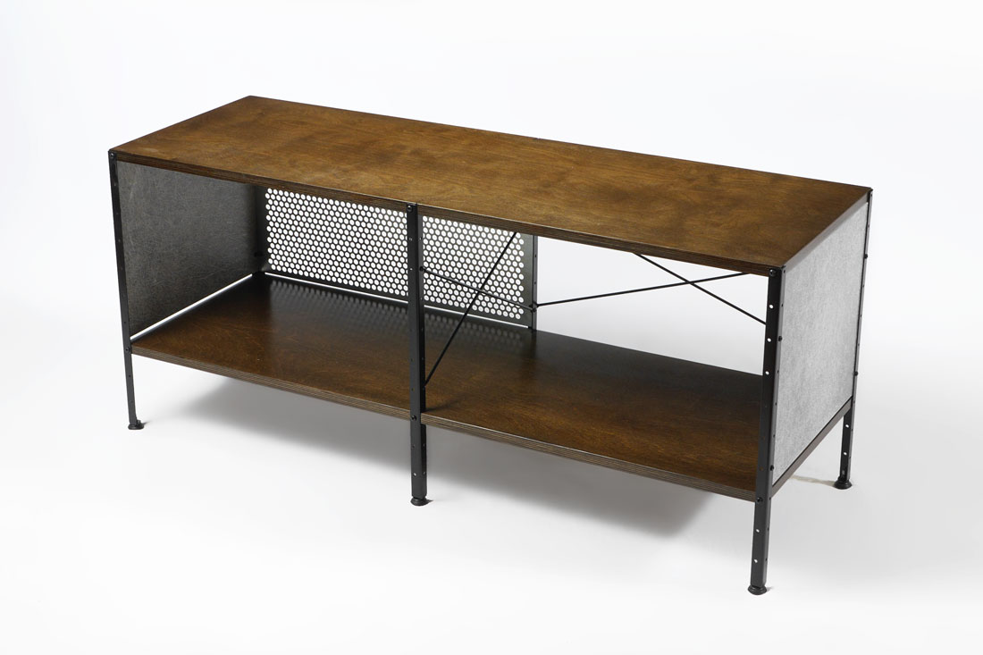 MODERNICA CASE STUDY 120 STORAGE UNIT: Reproduced with permission by Modernica in the style of the classic Eames Storage Unit (ESU) 100, walnut stain top and bottom, ghost fiberglass sides, openwork metal back one side, black hardware. Overall measures 20 1/2'' h. x 47'' x 16''.