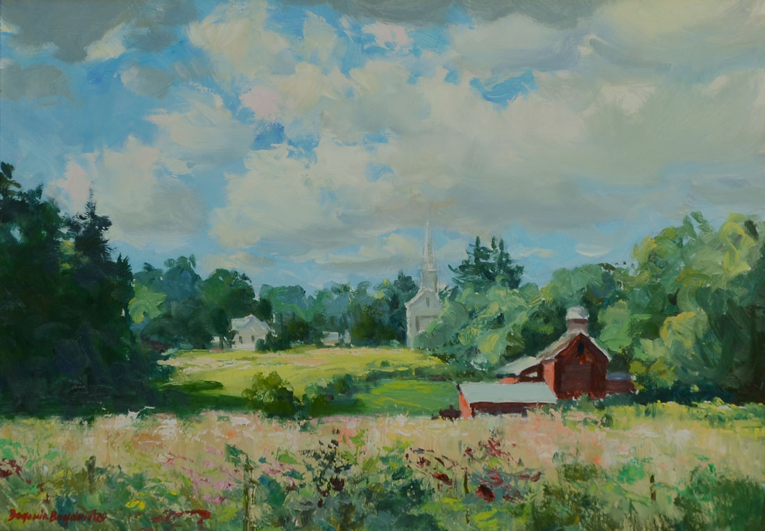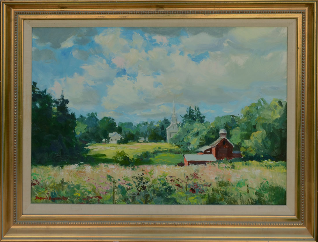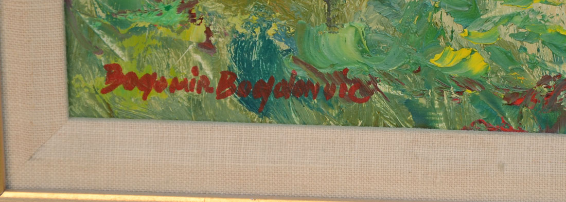 BOGDANOVIC, Bogomir (Yugoslavian, 1923 - 2011): ''Country Landscape with Church and Red Barn'', Oil/Board, 16'' x 24'', signed lower left, framed 20.50'' x 29''.