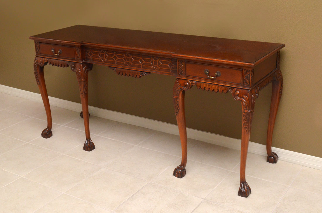 CONTEMPORARY CARVED CHIPPENDALE STYLE SIDEBOARD: Mahogany sideboard, carved center skirt with drawer wither side, carved and shaped legs ending in claw and ball feet. Measures 33 3/4'' x 72'' x 22''.