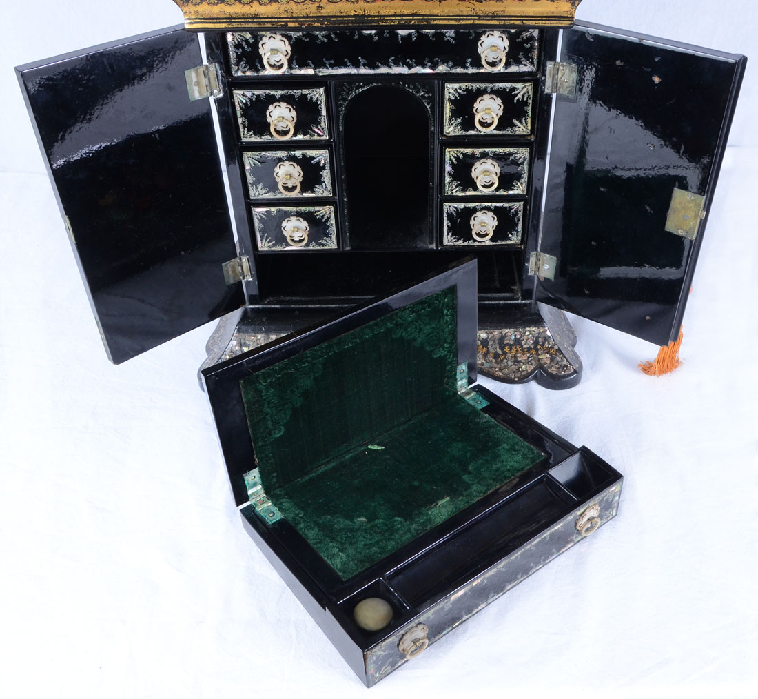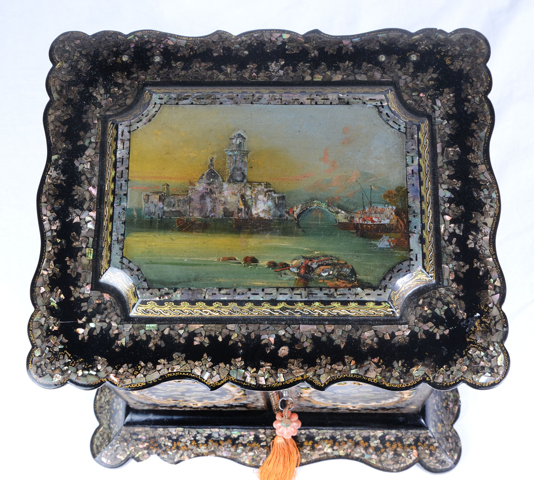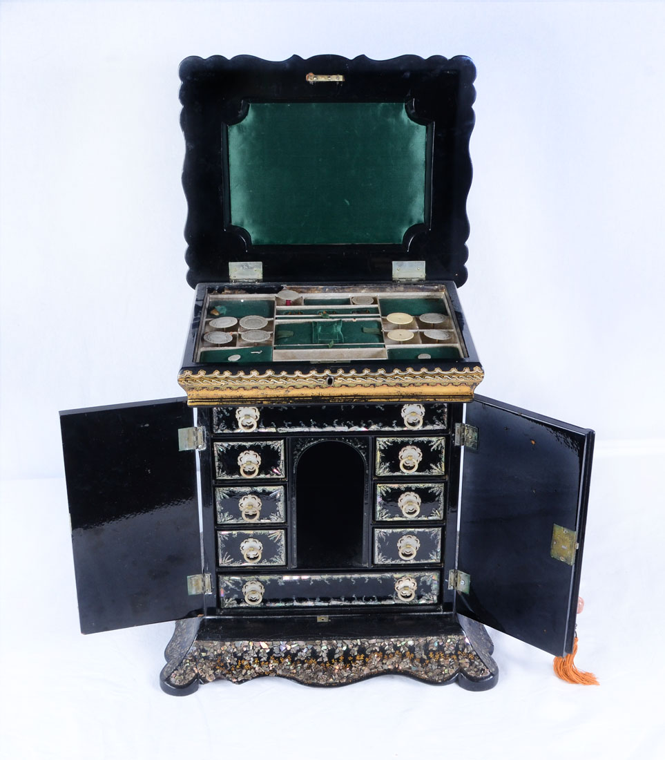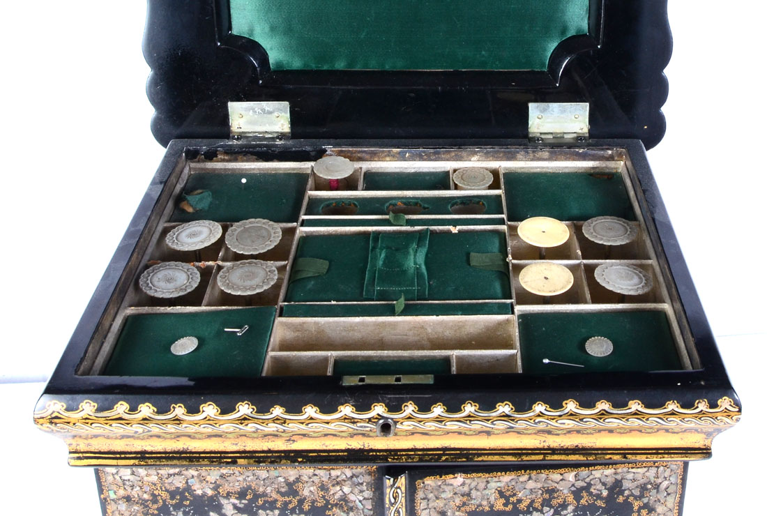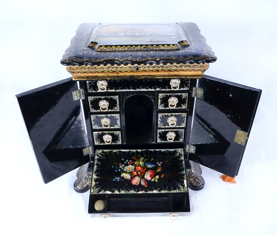VICTORIAN MOTHER OF PEARL PAPER MACHE SEWING BOX: Black lacquer case with ornate paper mache, abalone mother of pearl, and gilt chinoiserie style decoration all over. Hinged lid with fitted interior, felt lined accents. 2 door front opens to fitted drawer top, open arched center, 3 drawers either side, lower slide out travel desk with felt writing surface, shaped base. Overall measures 15'' h. x 14 3/4'' x 12 1/2''.