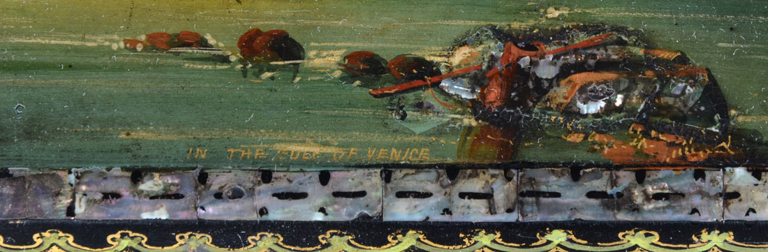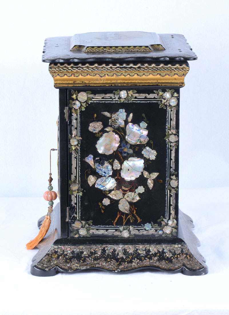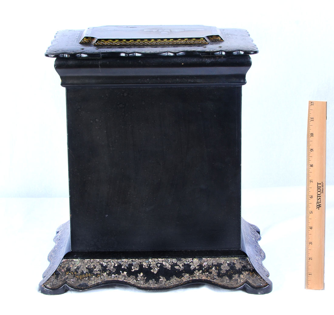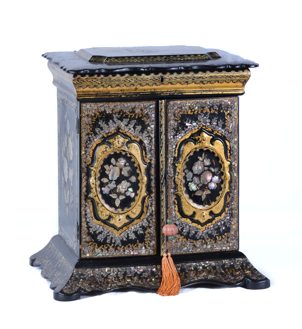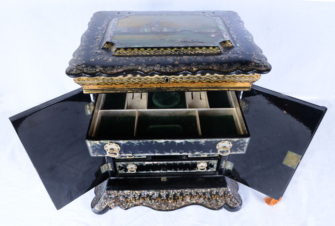 VICTORIAN MOTHER OF PEARL PAPER MACHE SEWING BOX: Black lacquer case with ornate paper mache, abalone mother of pearl, and gilt chinoiserie style decoration all over. Hinged lid with fitted interior, felt lined accents. 2 door front opens to fitted drawer top, open arched center, 3 drawers either side, lower slide out travel desk with felt writing surface, shaped base. Overall measures 15'' h. x 14 3/4'' x 12 1/2''.