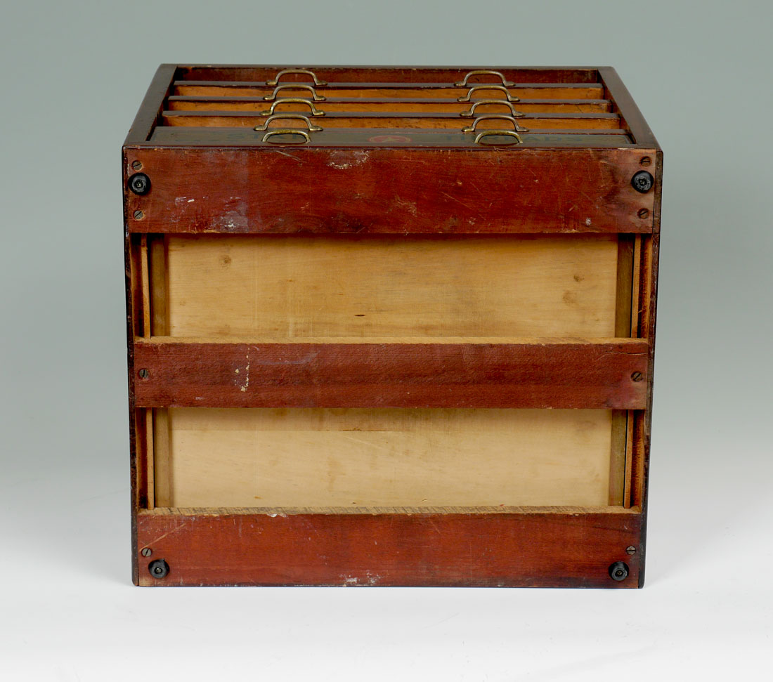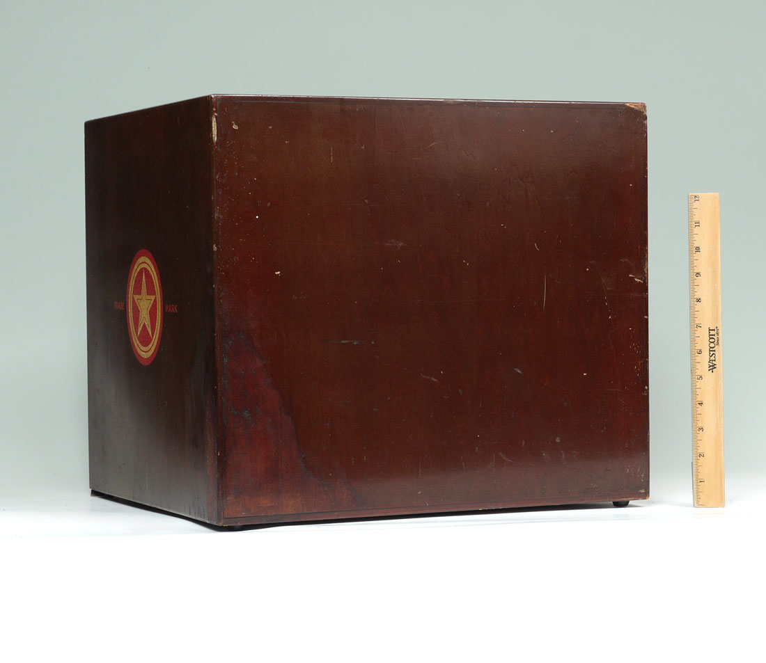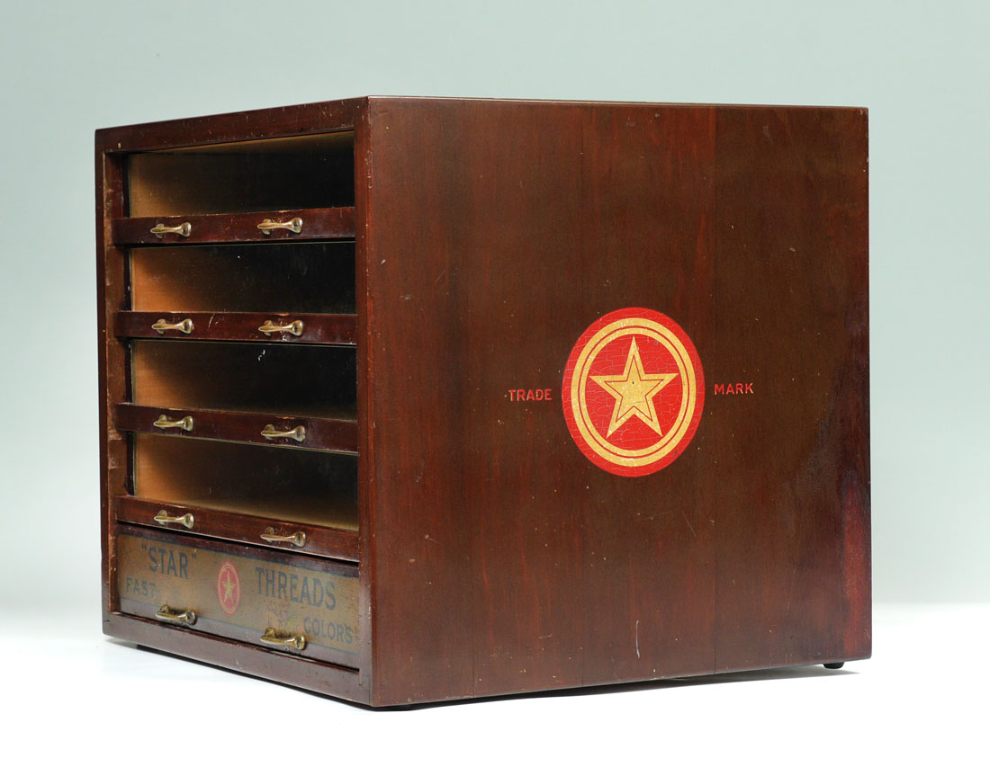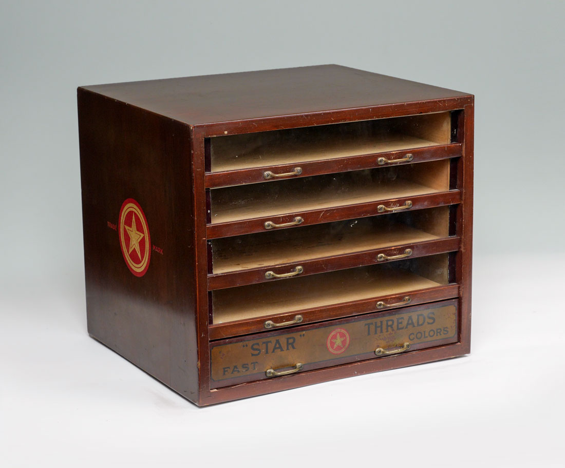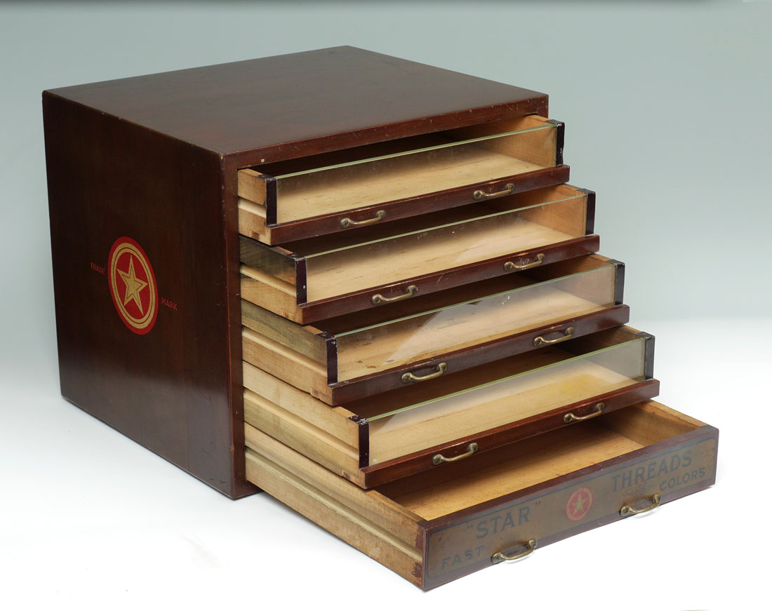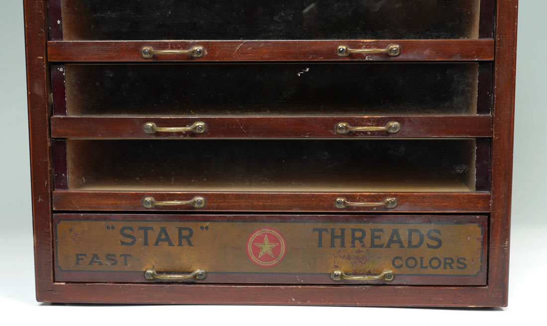 STAR THREADS 5 DRAWER SPOOL CABINET: ''STAR'' Threads advertising 5 drawer spool cabinet with 4 glass front doors, lower drawer with decals, star decals on sides. Overall measures 15 1/2'' h. x 18'' x 15 3/4''.
