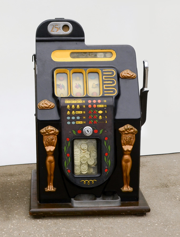 MILLS 25 CENT CAST IRON SLOT MACHINE: Circa 1940's, black and yellow restored case with bronzed maidens and clouds, very similar to the popular ''Golden Nugget'' style machine. Oak sides, overall measures 26 1/4'' h. x 16'' x 13''. No key.