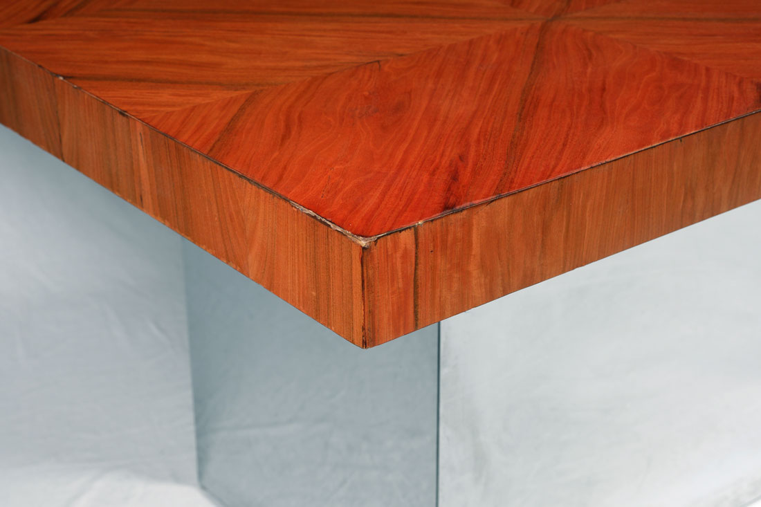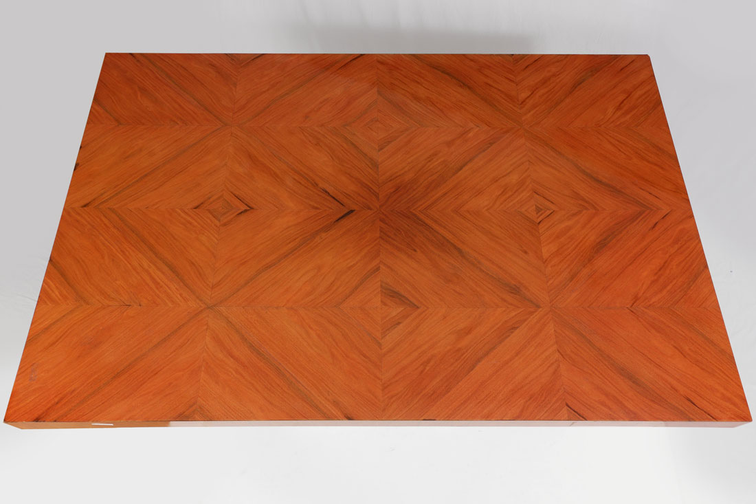 MILO BAUGHMAN FOR THAYER COGGIN DINING TABLE: Fixed rectangular parquetry top over smoky chrome box base, top measures 66 3/4'' x 44'', base 28 1/4'' . x 19 1/4'' x 40 1/4''.